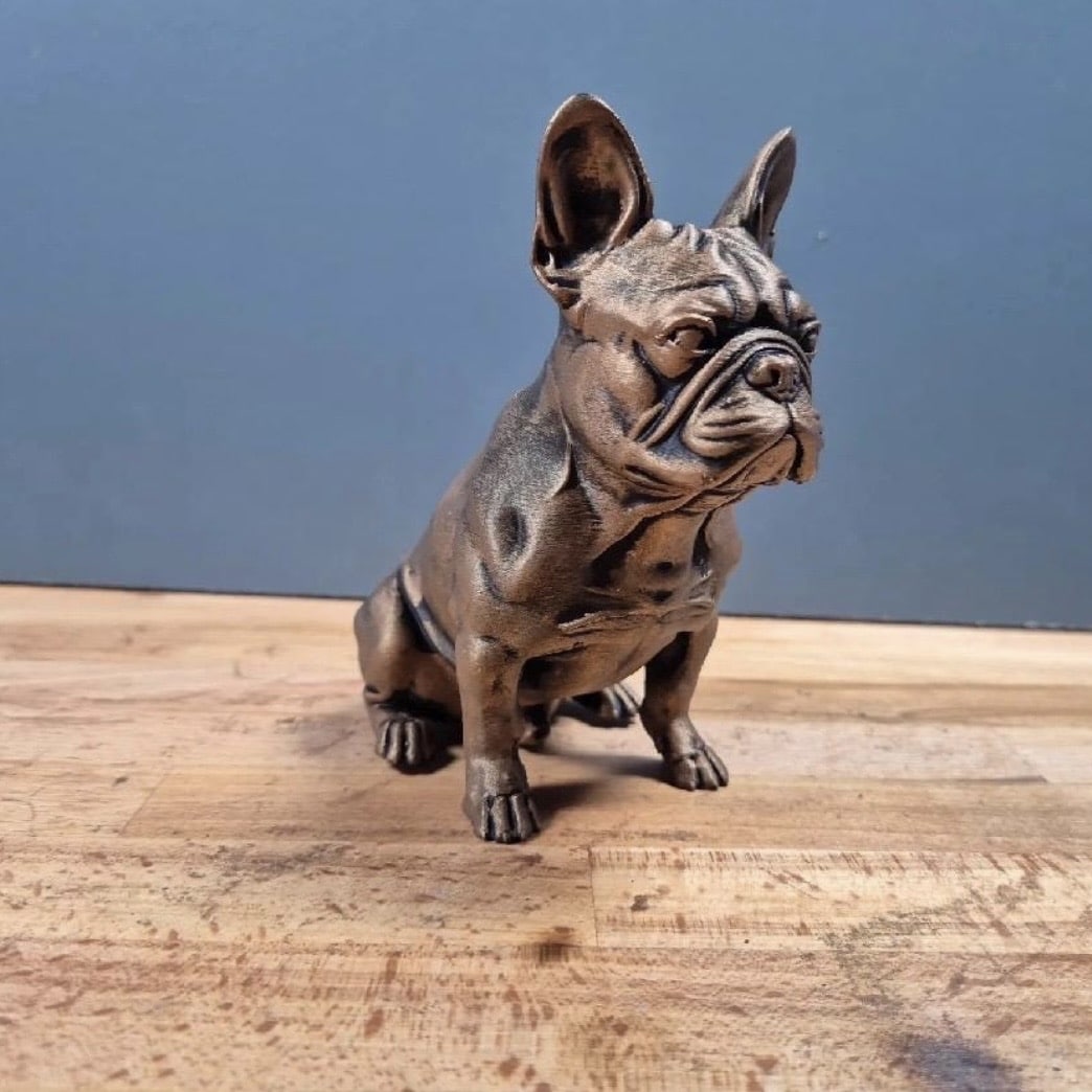 A characterful 3D-printed French Bulldog sculpture, designed to capture the breed’s distinctive charm and expressive features. Finished with carefully applied gold wax accents, the detailing is softly highlighted across the ears, face, and body contours, adding depth, warmth, and a subtle metallic glow. The interplay between the smooth printed form and the luminous gold highlights enhances texture and personality, resulting in a modern yet handcrafted decorative piece—perfect for Frenchie enthusiasts and contemporary interiors.