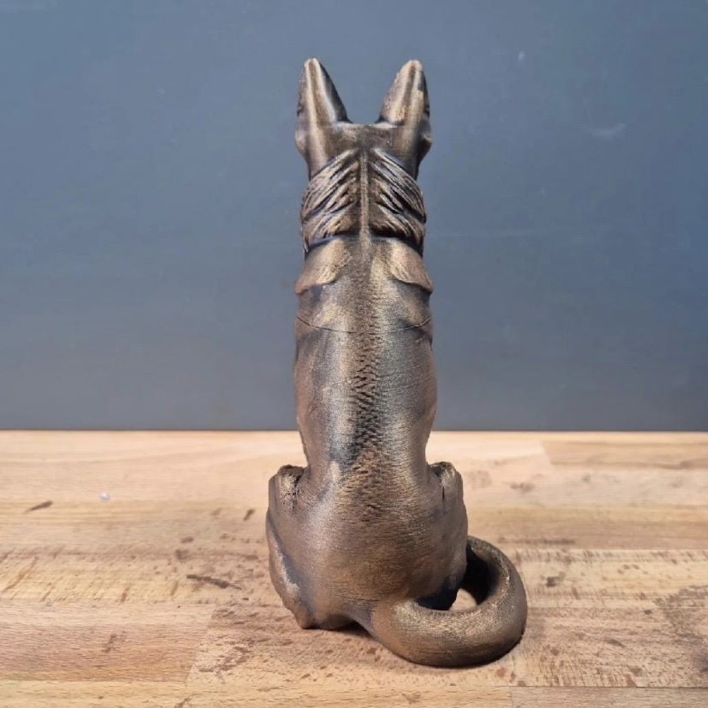 A beautifully detailed 3D-printed German Shepherd sculpture, crafted to capture the breed’s expressive eyes, delicate features, and flowing coat. Hand-applied gold wax accents softly highlight the fur texture, facial details, and elegant contours, adding depth, warmth, and a subtle metallic glow. The interplay between the smooth printed form and the artisanal gold detailing creates a refined yet contemporary decorative piece, perfect for German Shepherd lovers.