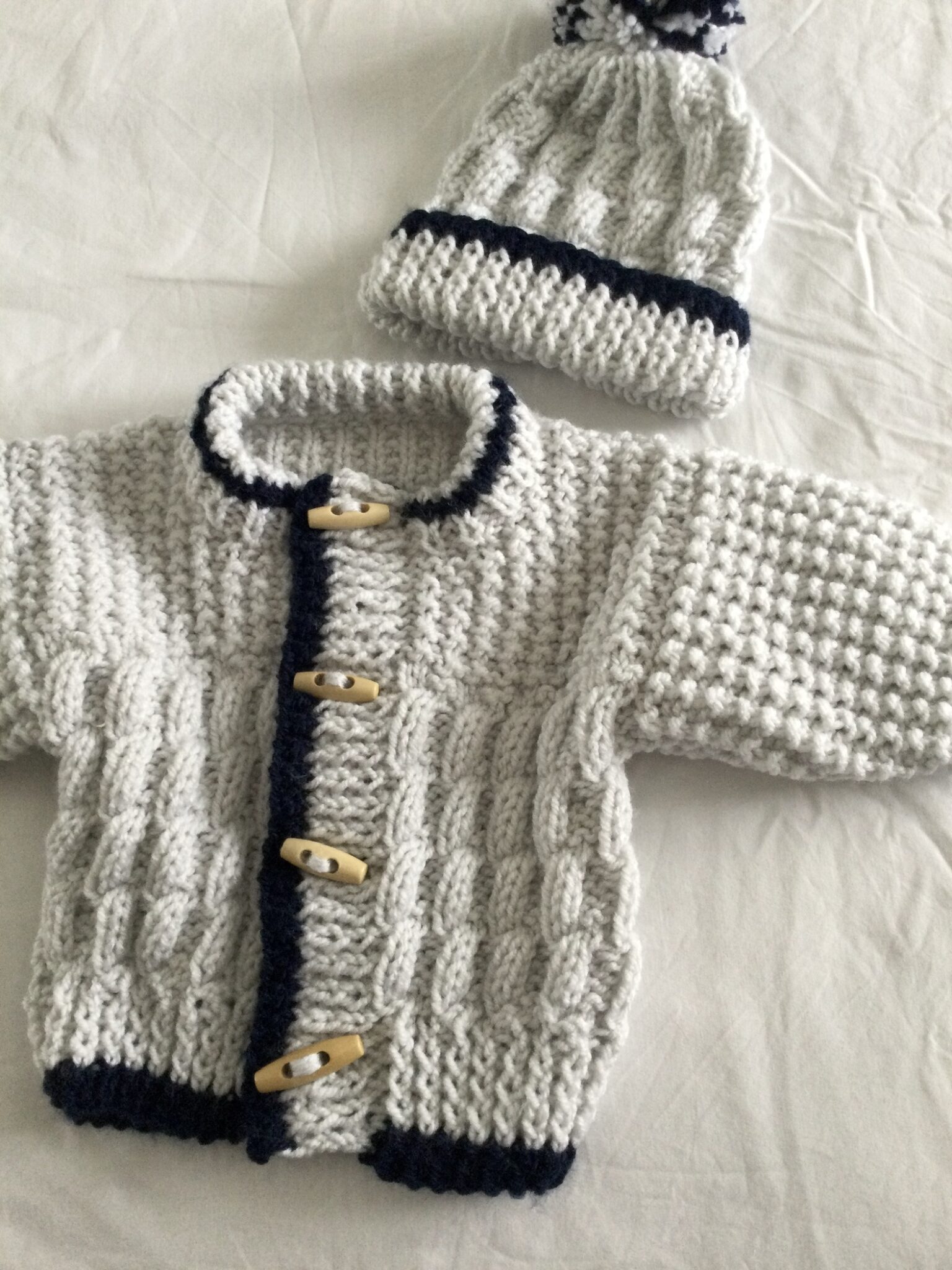 Hand made Aran set in soft baby yarn, cardigan and bobble hat in pale grey with contrasting navy yarn and wooden toggles to fasten, includes bootees, would fit 0-3 months approximately.