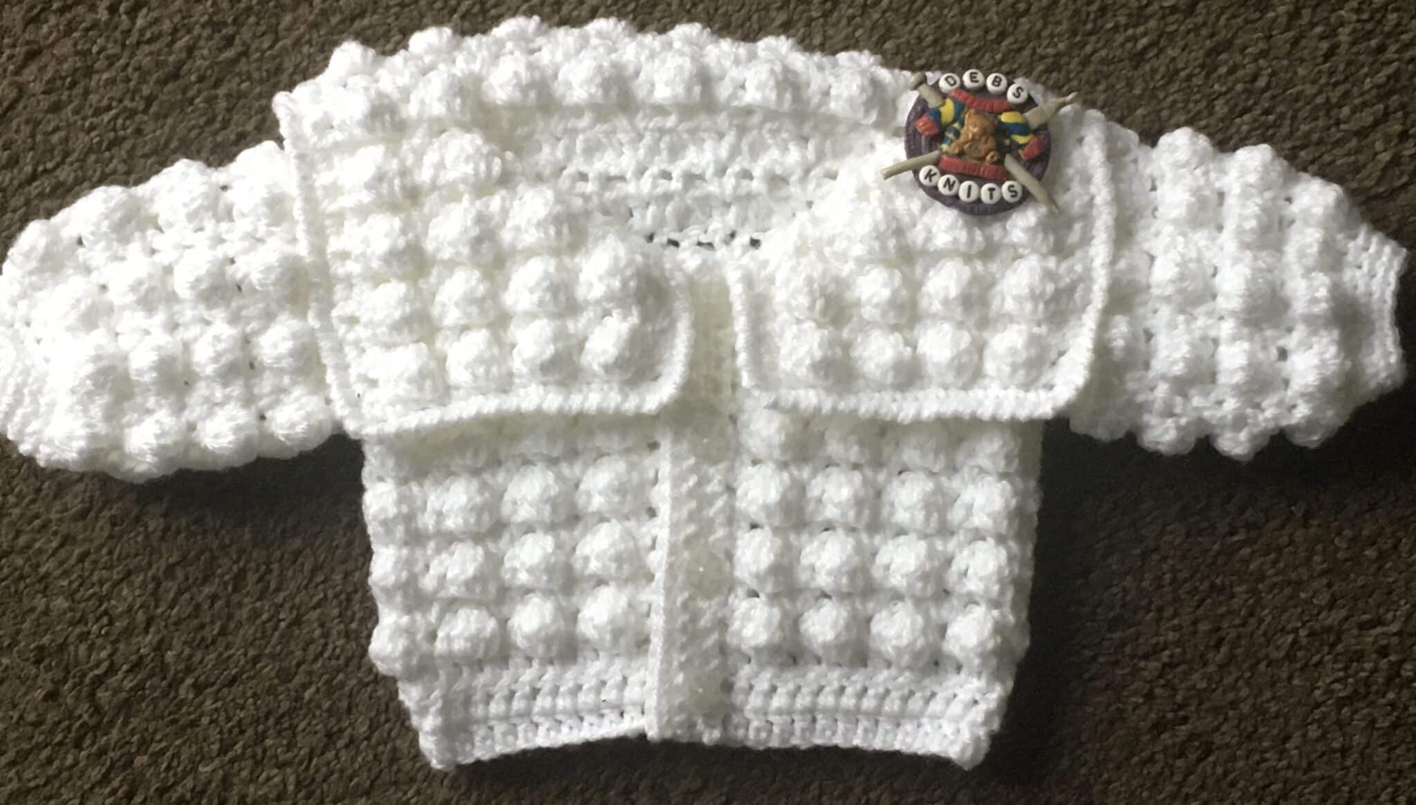 Aran pompom jacket in 0-3 and 3-6 month size. Available in Blue, White or Pink