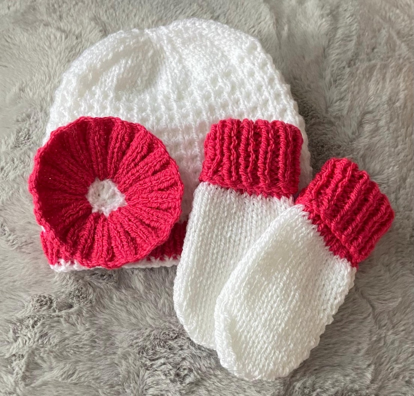 This white and red beanie hat and mittens set is hand knitted from acrylic material, making it perfect for keeping a baby warm and cosy during the colder months. Suitable for babies aged 0-3 months, the casual style is versatile and practical for everyday wear. The set would make a cute addition to a baby’s wardrobe. The hand-knitted design adds a special touch, while the knit fabric ensures comfort and warmth for the little one.