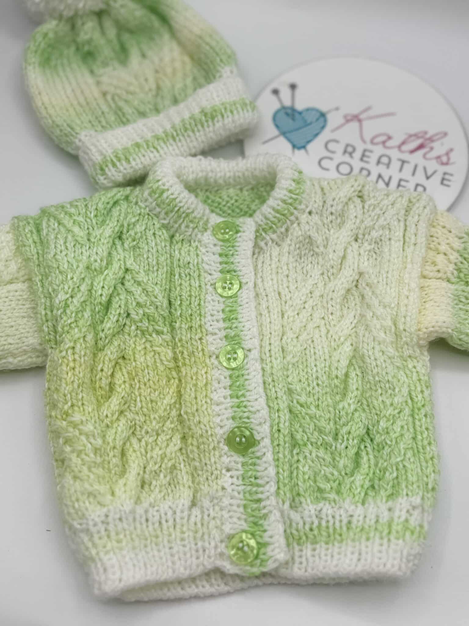Hand knitted baby set comprises of cardigan and hat finished off with contrasting buttons.