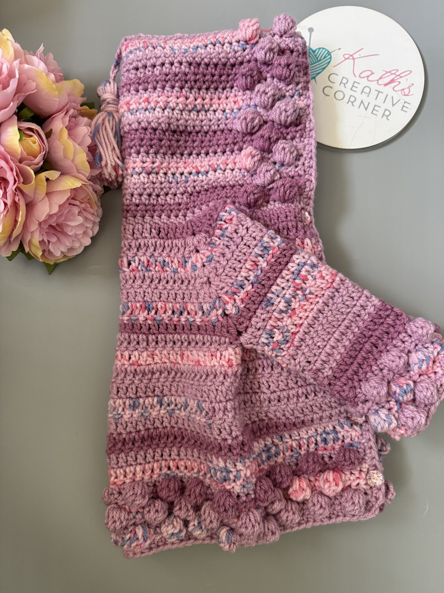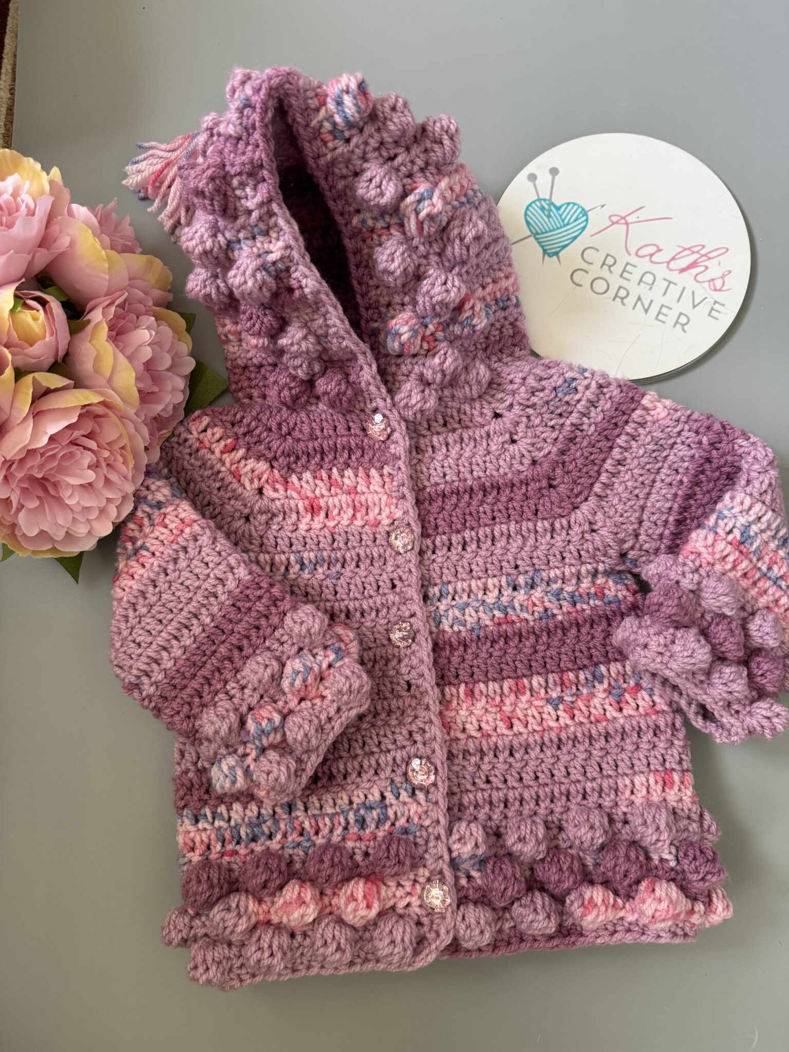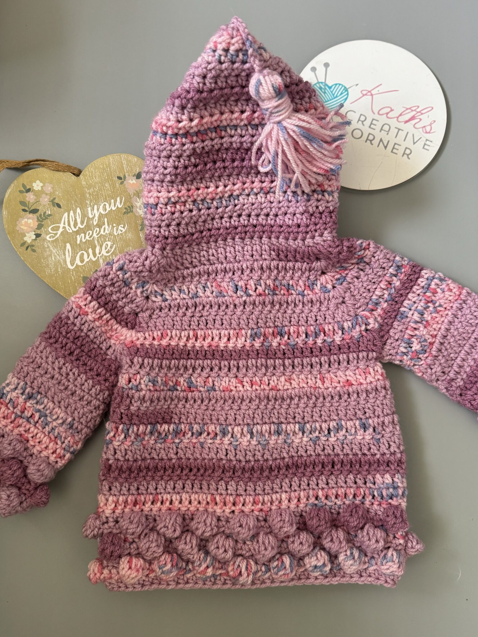 Cute aran jacket in shades of pink and lilacs fits 3-6 months up to 20″ chest.