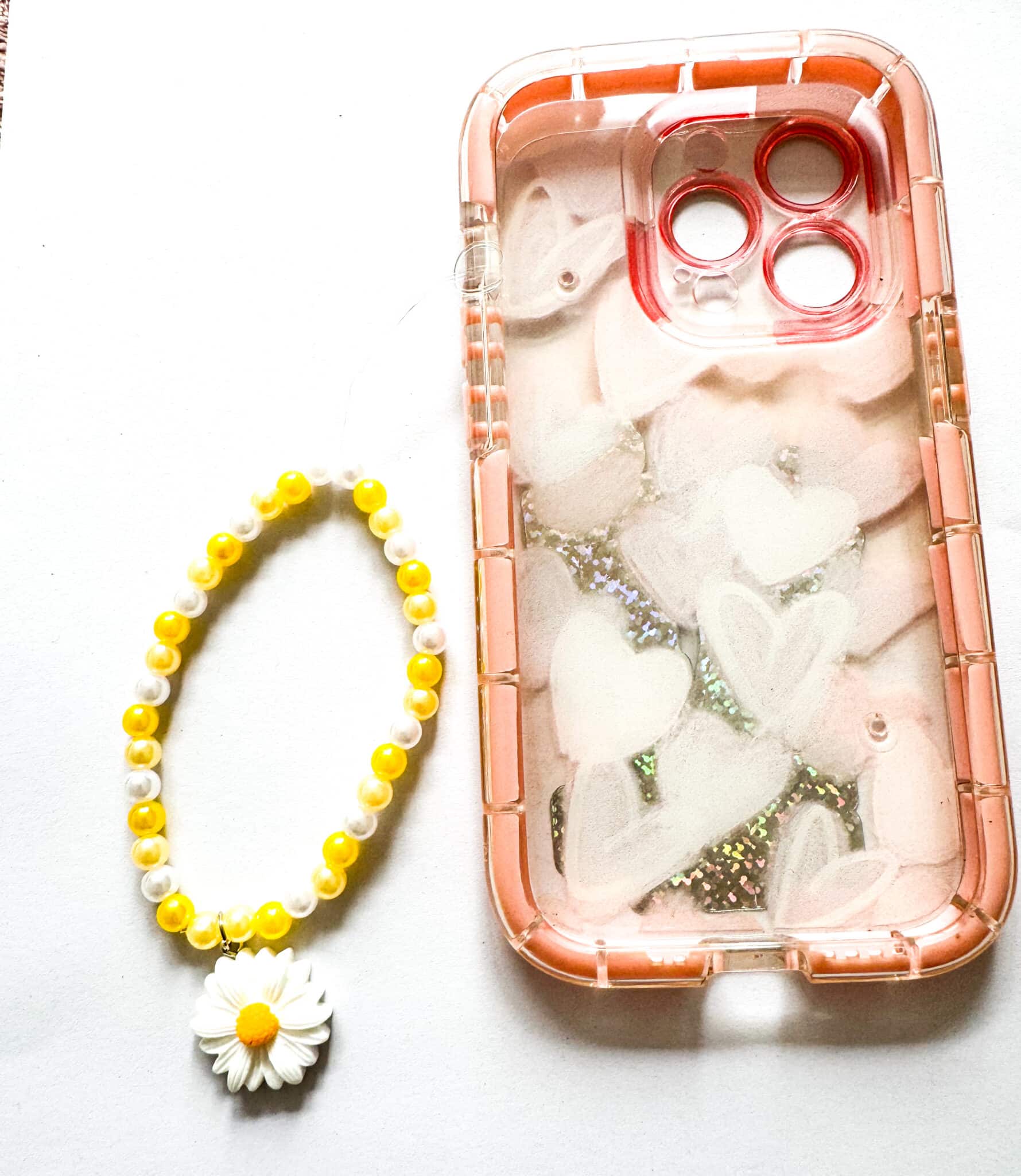 2) is made with white, yellow and light gold pearl beads and finished with a sunflower charm.