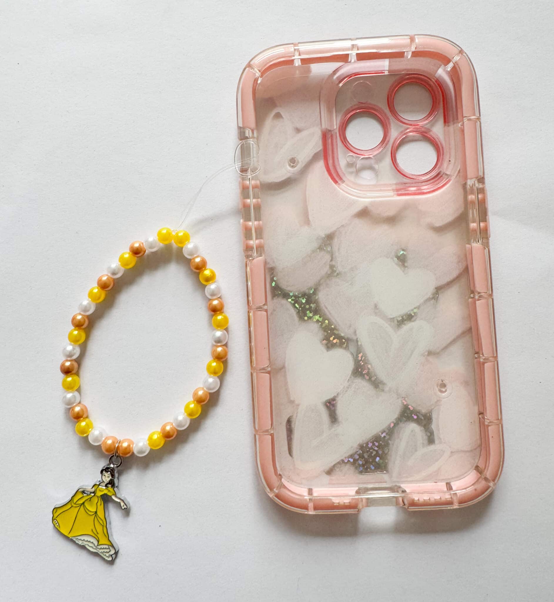 3) is made with yellow, white and light brown pearl beads and finished with a belle princess charm.