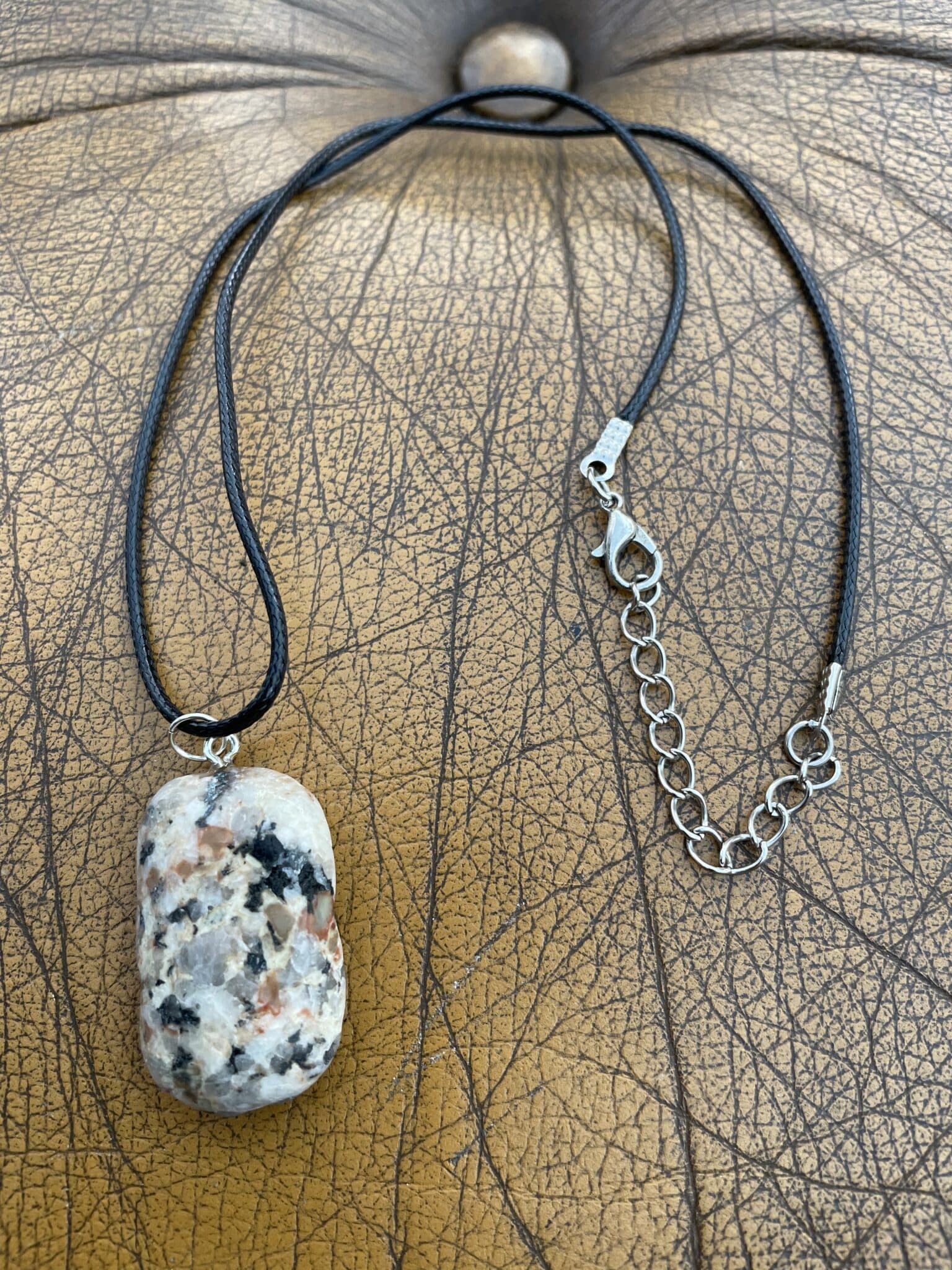 This beautiful stone has been chosen for its natural special colouring, hand crafted by myself in Cornwall using sterling silver fittings.The Granite has taken about a month to achieve its shiny finish using the tumbling method, a mechanical action which simulates pebbles being rolled along the shoreline for years and years.