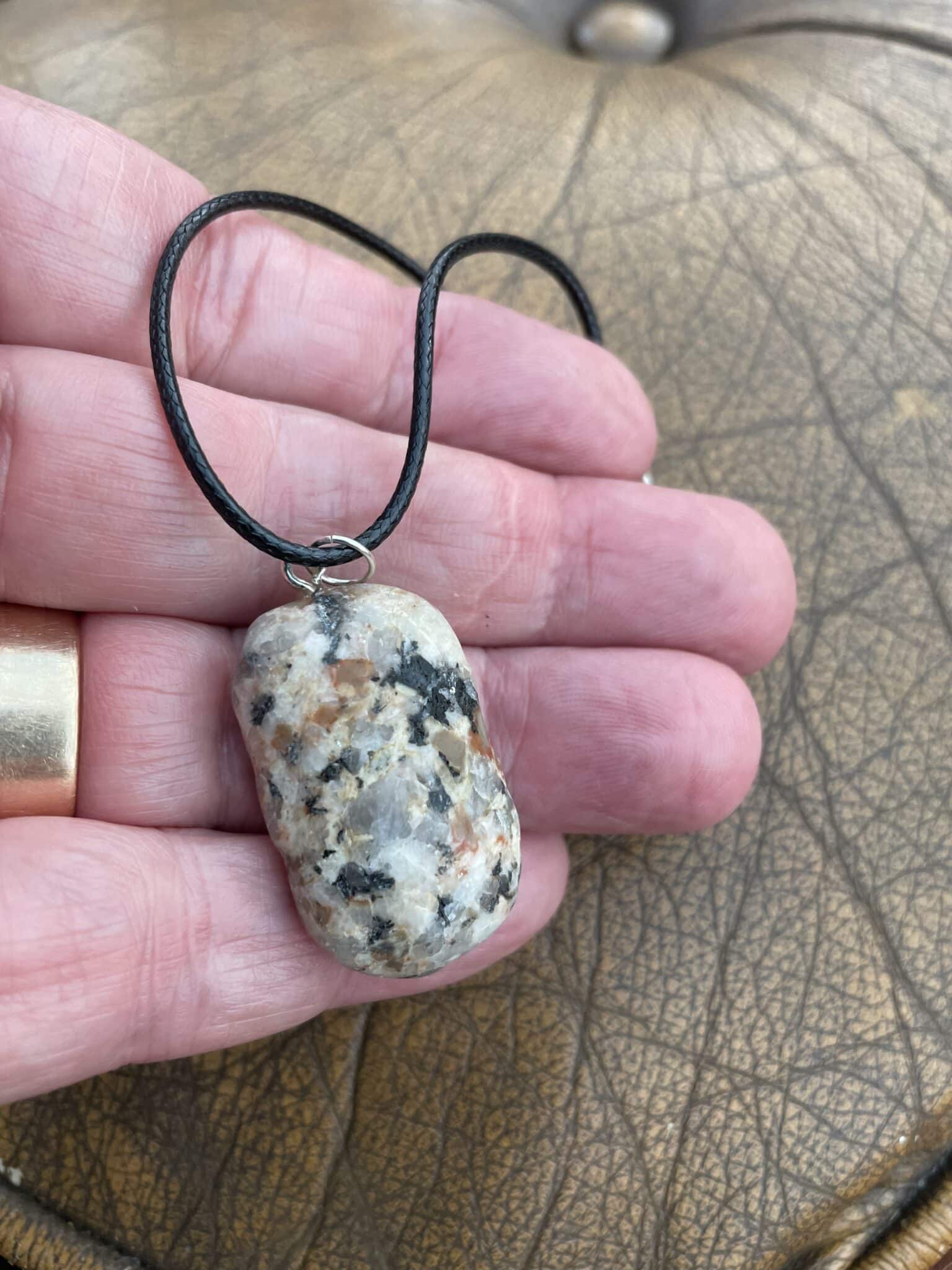 This beautiful Cornish Granite Pendant is composed primarily of quartz and feldspar, It also may contain Orthoclase, which is a form of feldspar which can form in plate-like layers with short prismatic crystals and tabular inclusions,