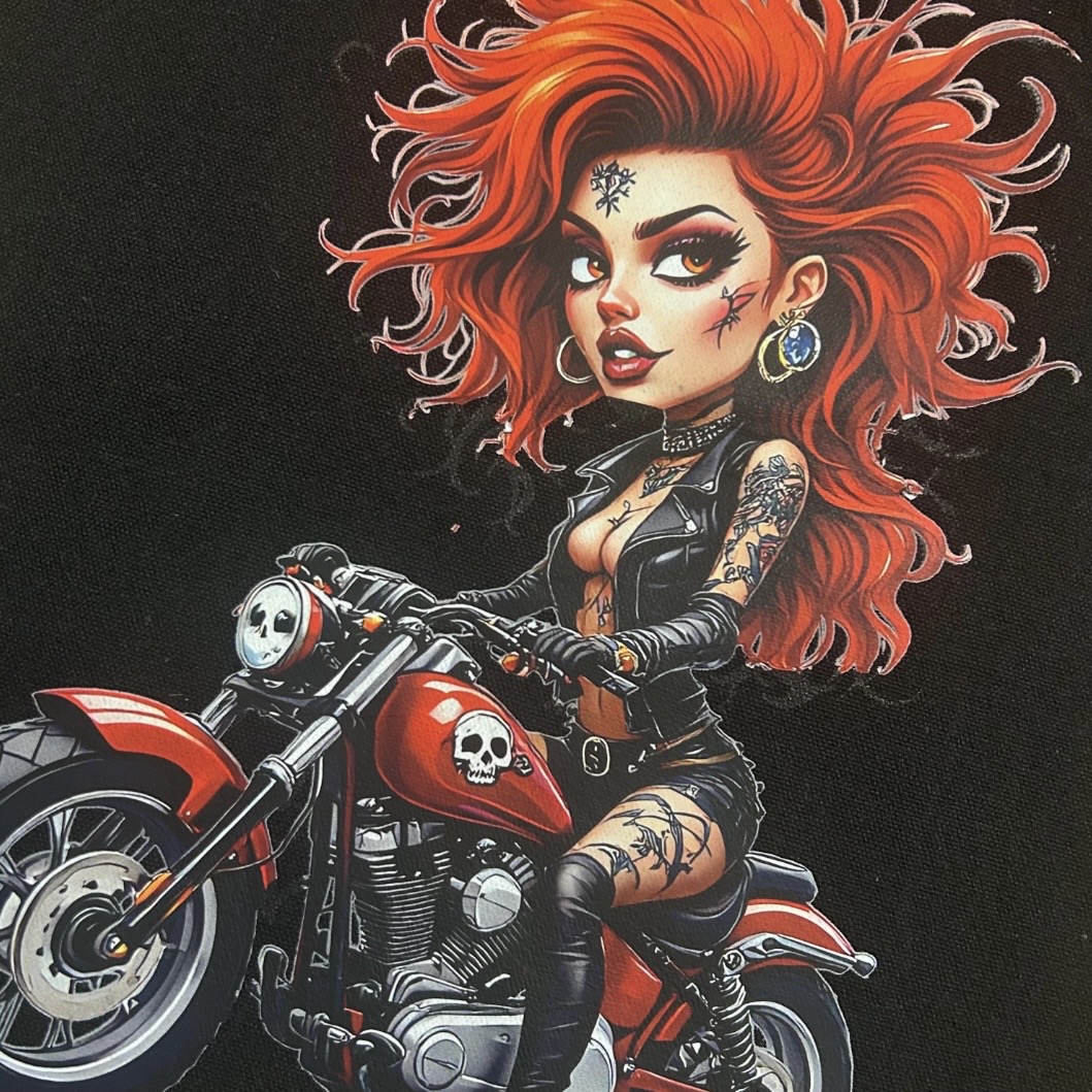 Turn heads with this bold and edgy black tote bag featuring a fierce red-haired biker chick in full throttle.