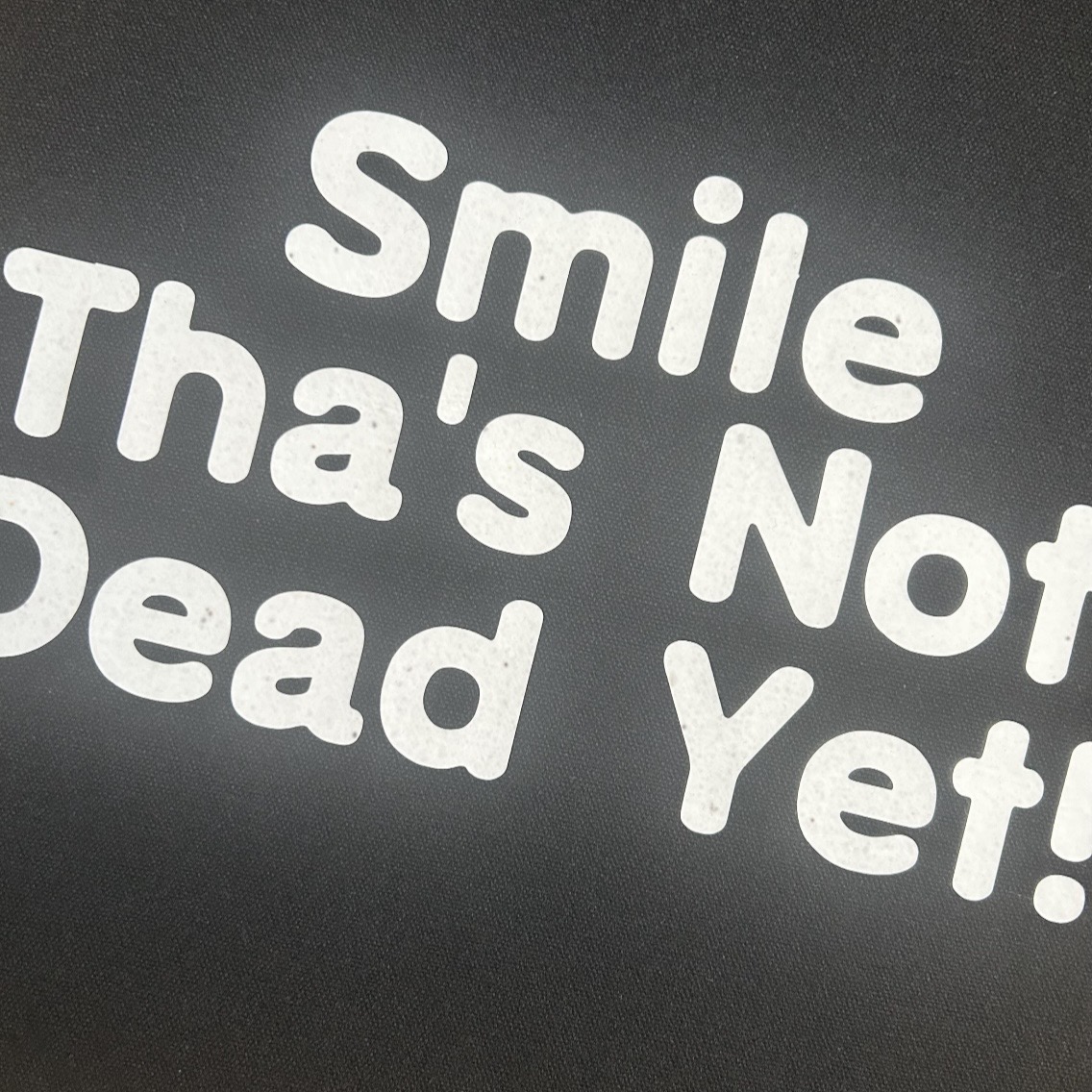 Black Tote with Smile Thas Not Dead Yet slogan, shopper,