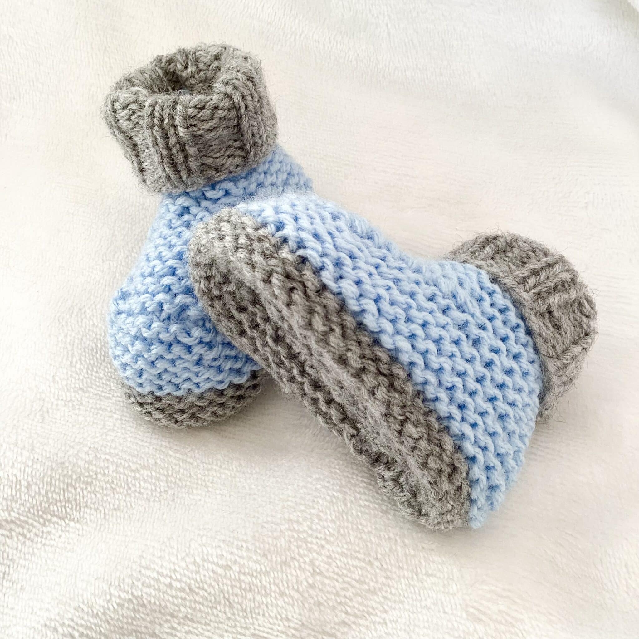 Hand knitted blue baby booties with grey soles and ribbed cuffs in 2 sizes from premature to 3 months