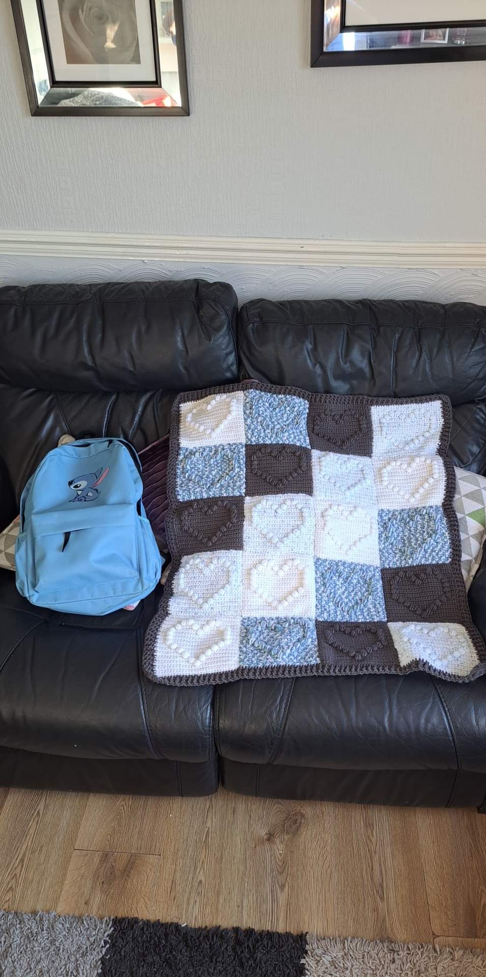 This blue blanket pictured is ready to post – other colours and sizes would need to be ordered