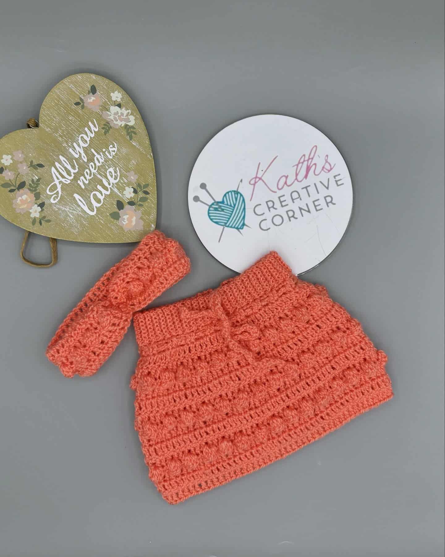 Gorgeous little bobble cardigan with matching skirt and headband in the colour Coral with little wooden buttons. Made in size birth to 3 months.