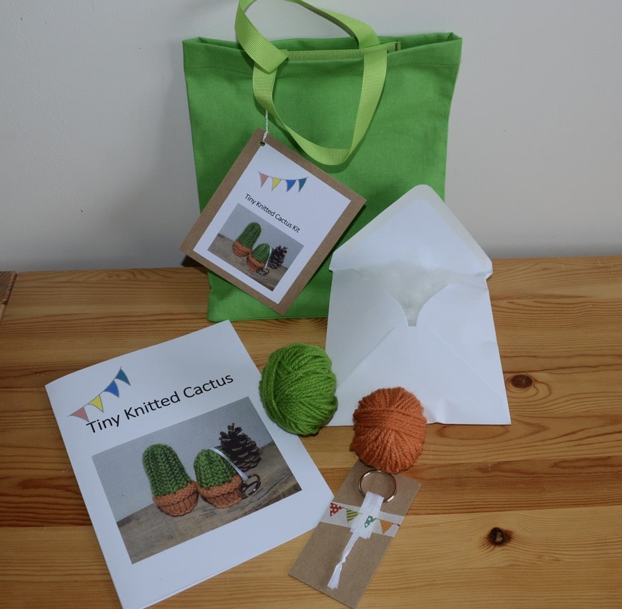 Kit containing all the acrylic yarn, stuffing, keyring and printed instructions to knit  2 mini cacti.  Kit makes 1 mini desk cactus and 1 keyring / bag charm cactus.