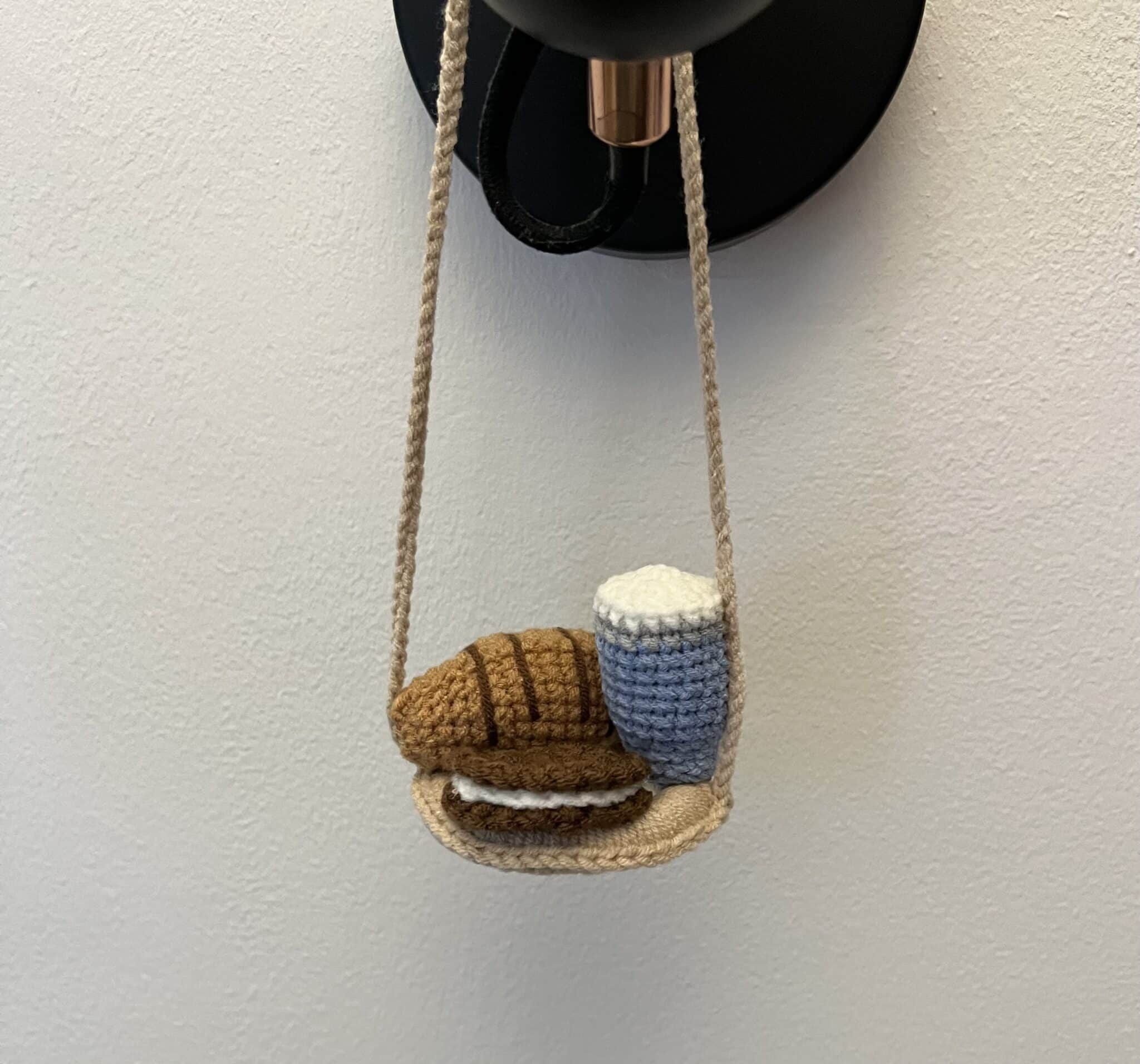 Cute Amigurumi hanging swing accessories, for your car mirror or for your home. Chick, cat and coffee tumbler, cookie and croissant.