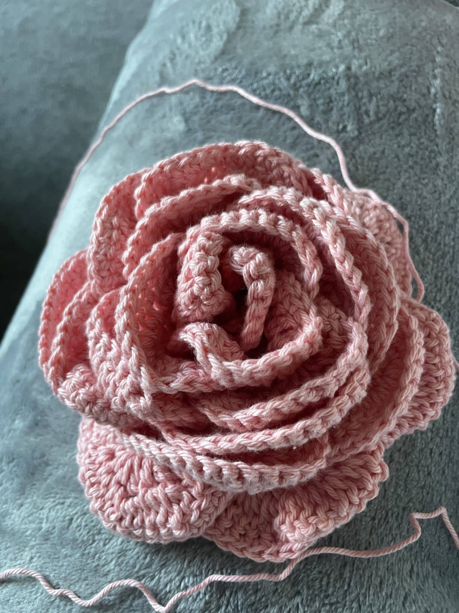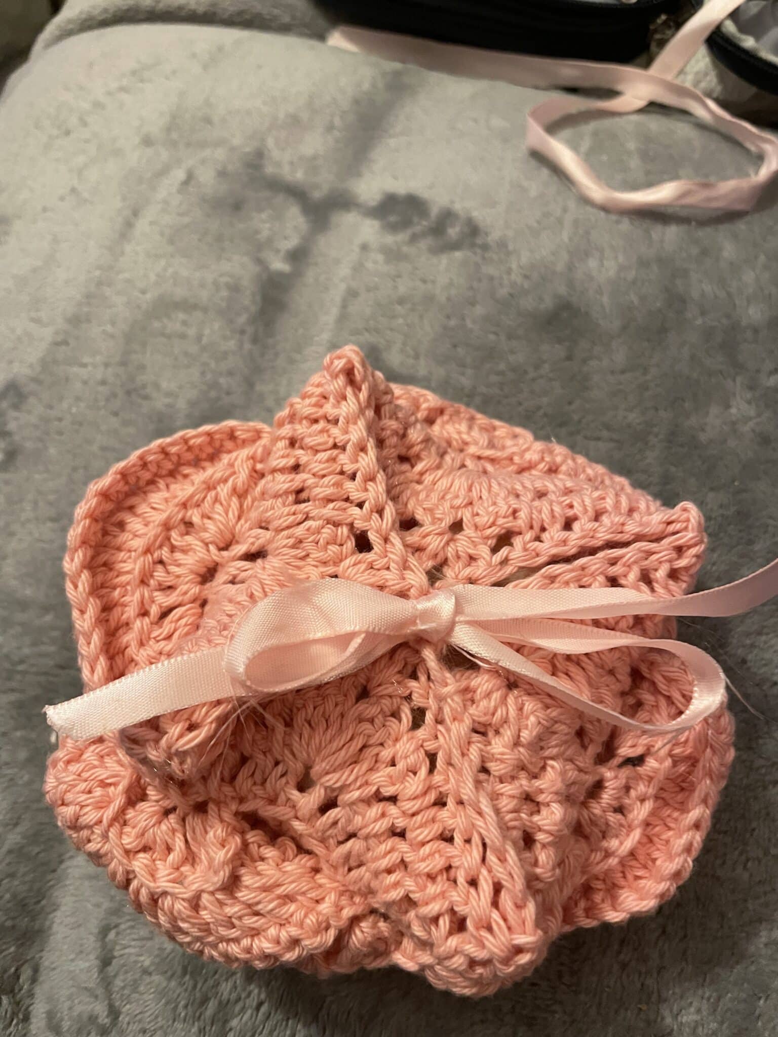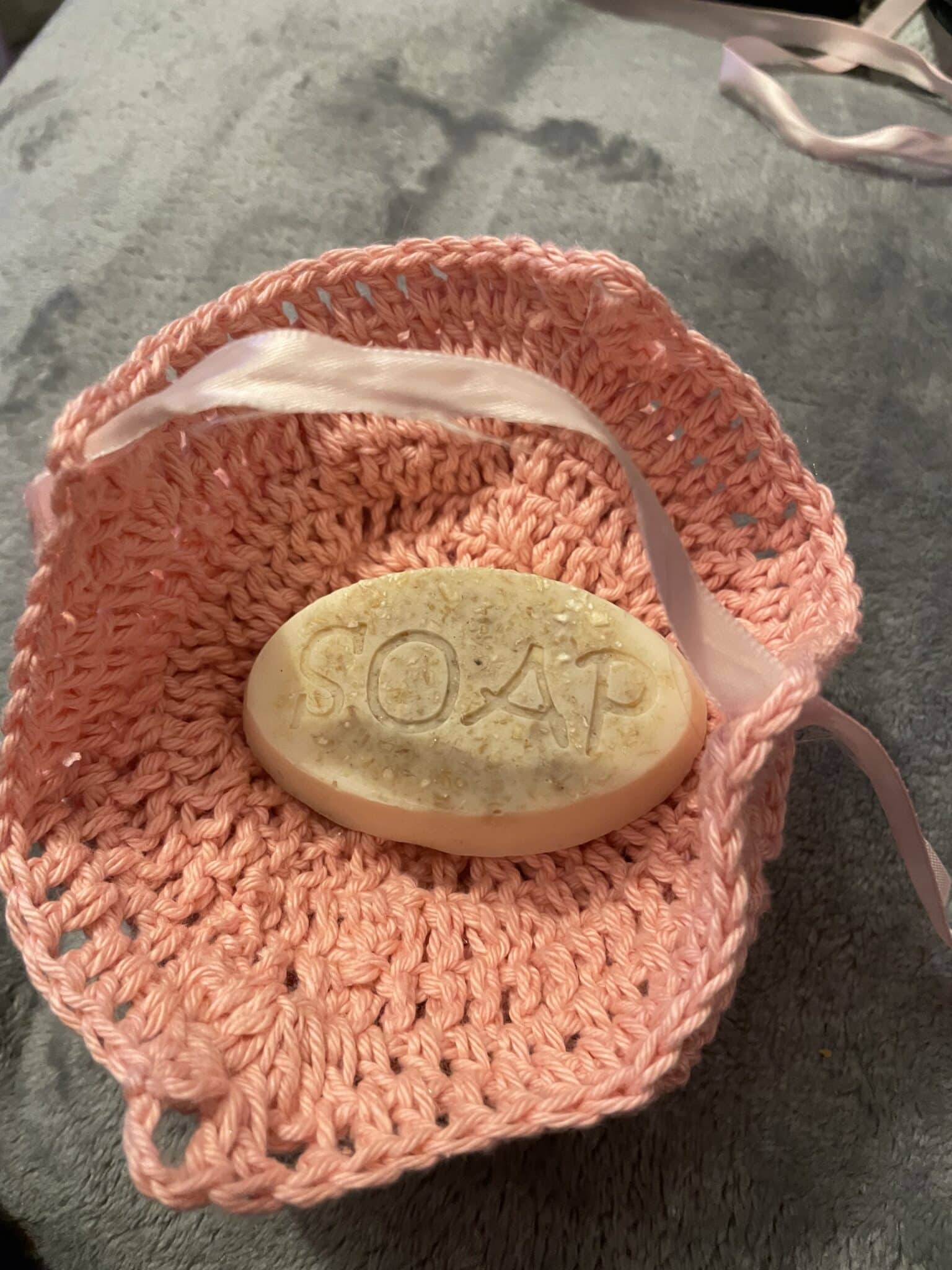 A crochet sachet in a delicate rose pattern. Use for holding that perfumed soap or gifting that special gift.