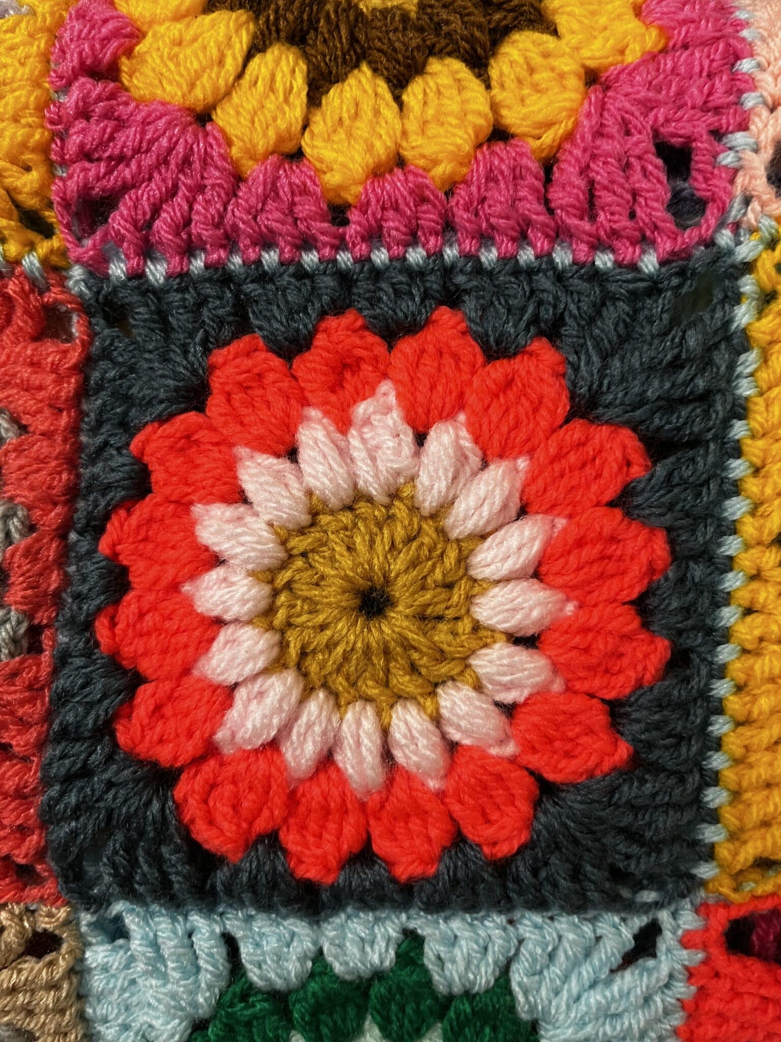 This blanket is made of granny squares, measuring a total of 137cmx135cm. It’s crafted with acrylic wool, making it soft and durable. Perfect for your bed, cozy sofa nights, or as a colorful room decoration. If you have questions, feel free to ask!
