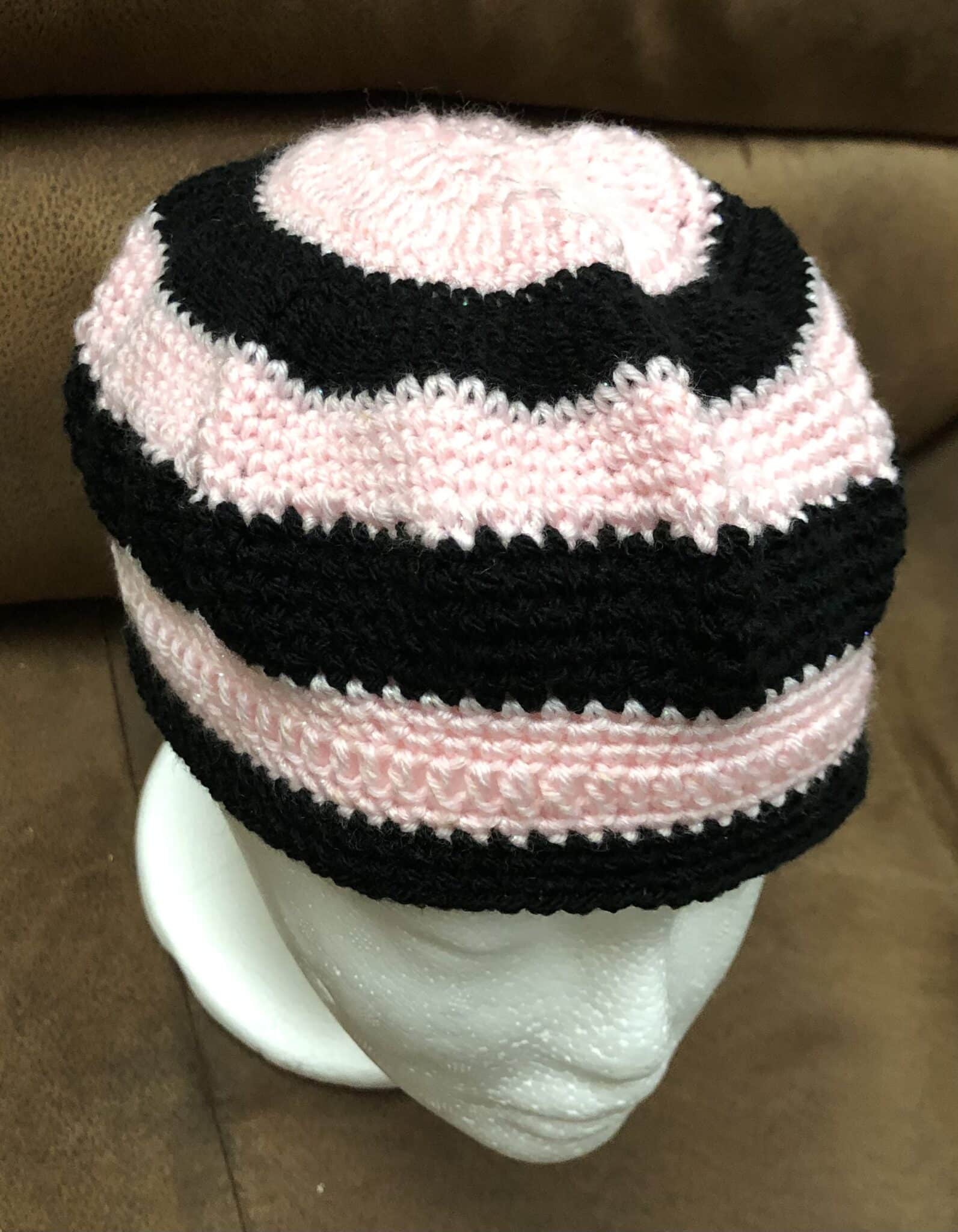 Sparkly pink and black crotchet hat. Adult size