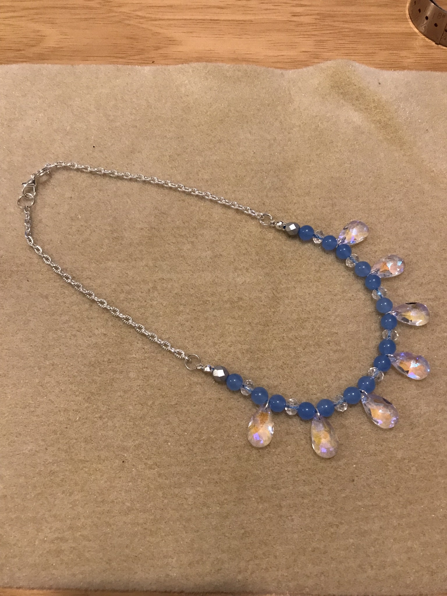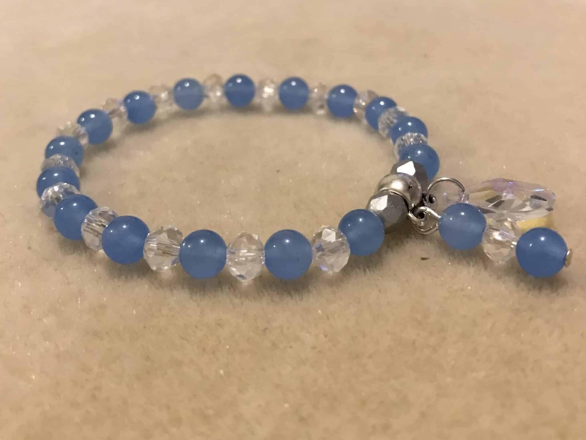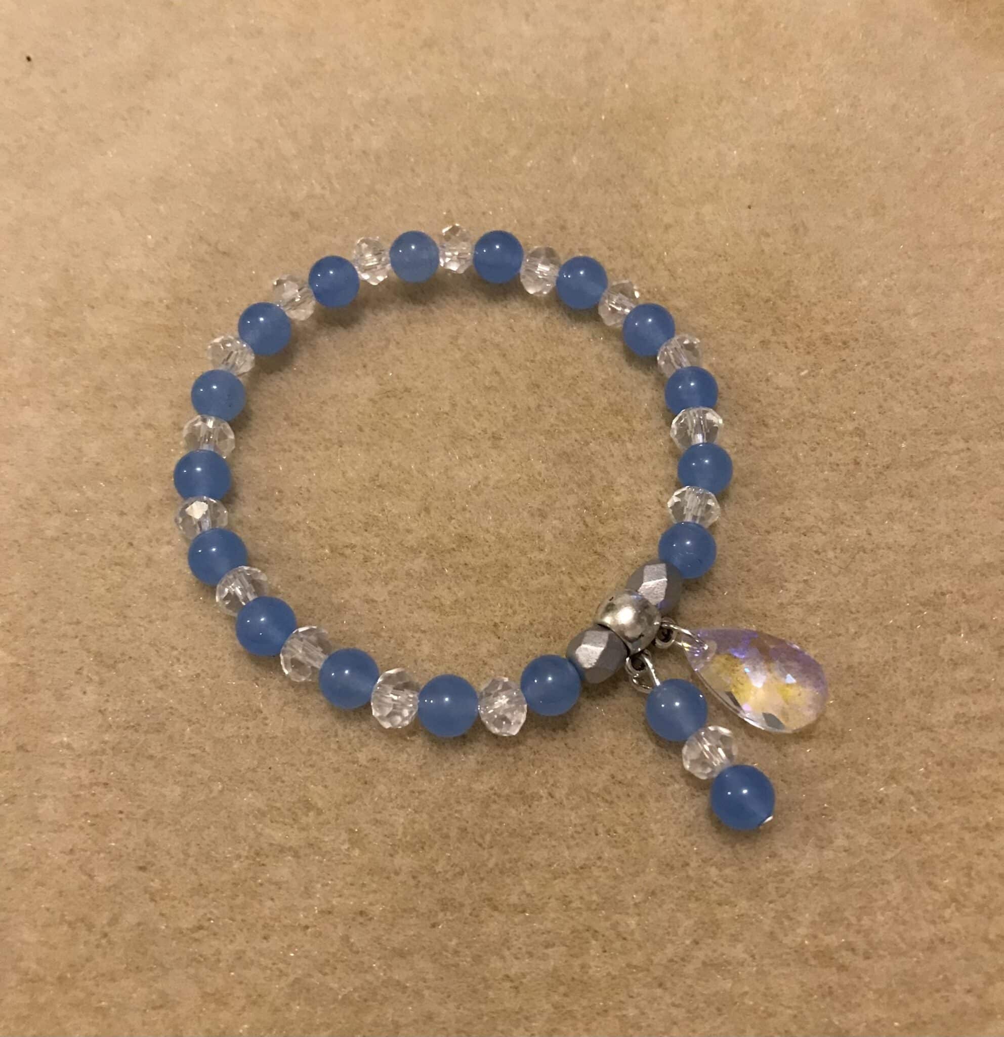 This set is made with 6mm gemstone cyan Malaysian Jade beads, 6mm clear crystal beads, 6mm silver Czech fire polished beads, crystal drops , silver plated hooks, chain, clasp, charm holder.