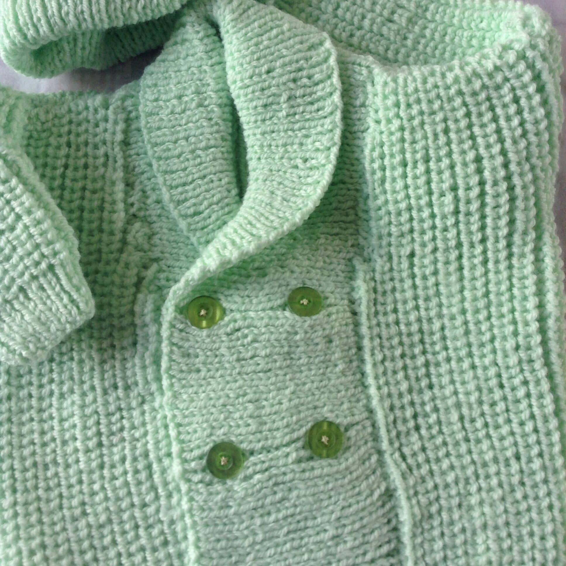 This jacket is hand knit in chunky yarn. Features a double breast fastening with 6 buttons and has a shawl collar.