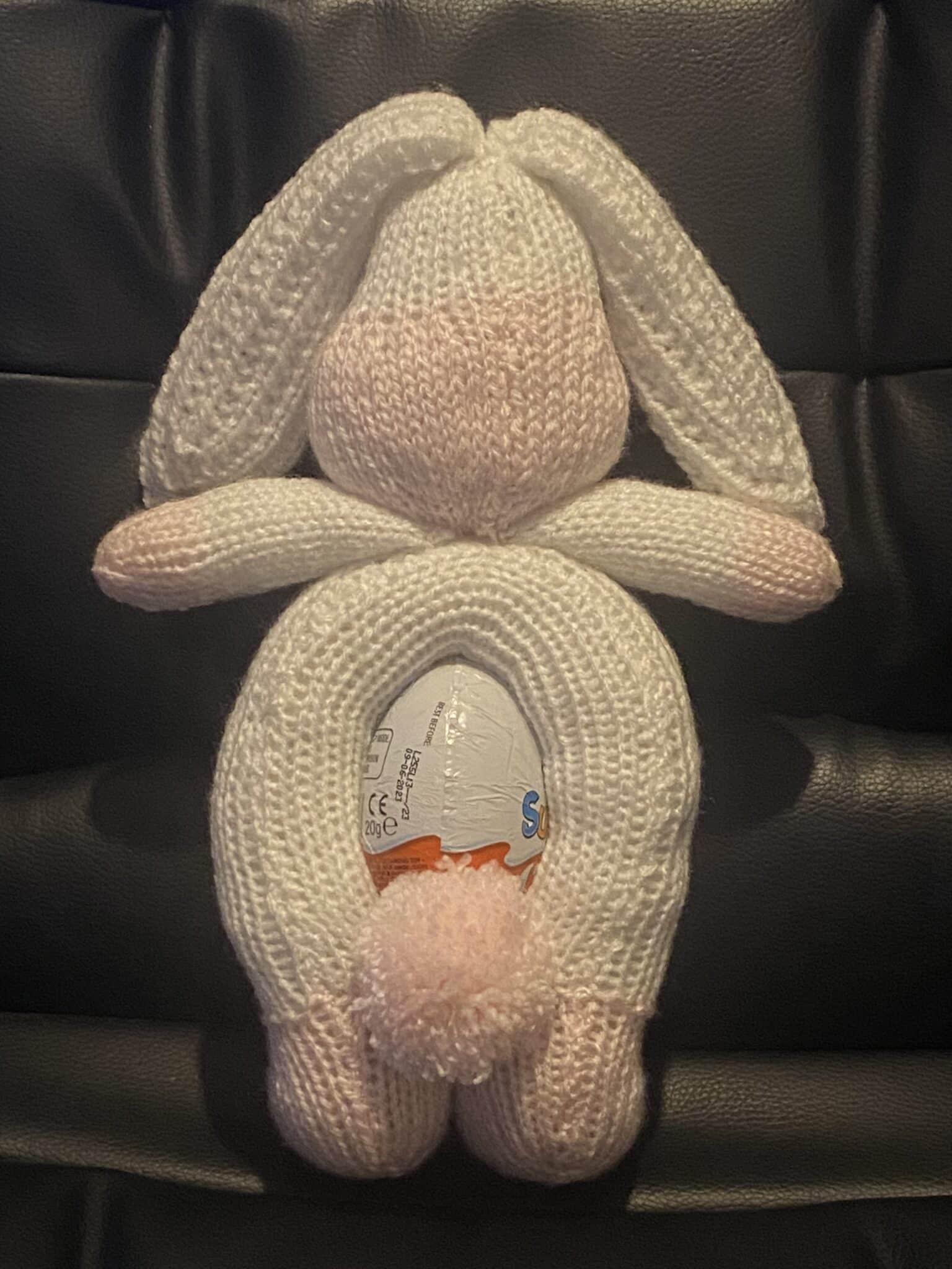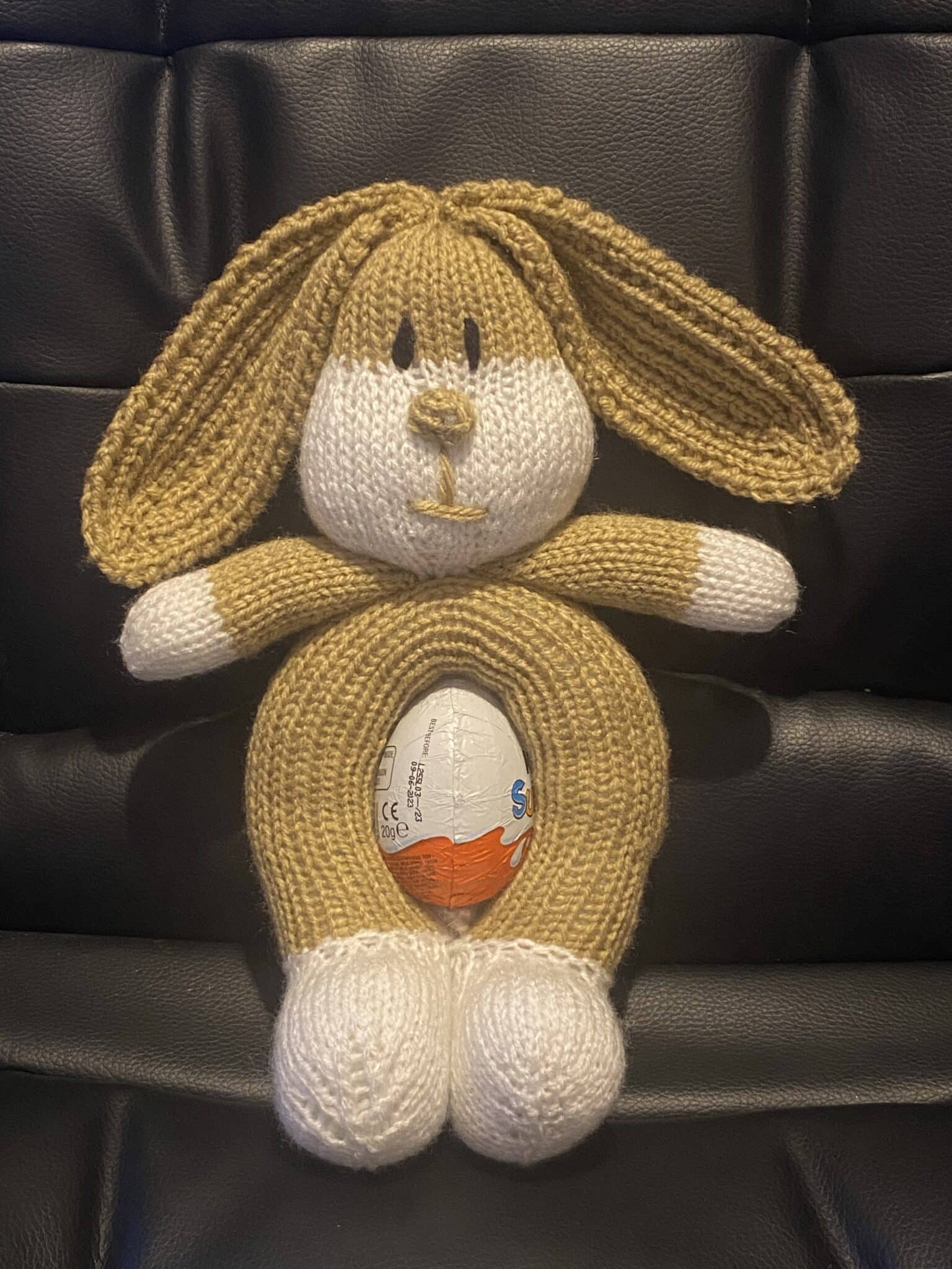Hand made Easter bunny kinder egg holder available in any 2 colours you would like (please message me with what colours you would like) if none stated one will be sent at random. Please note the chocolate is not included.