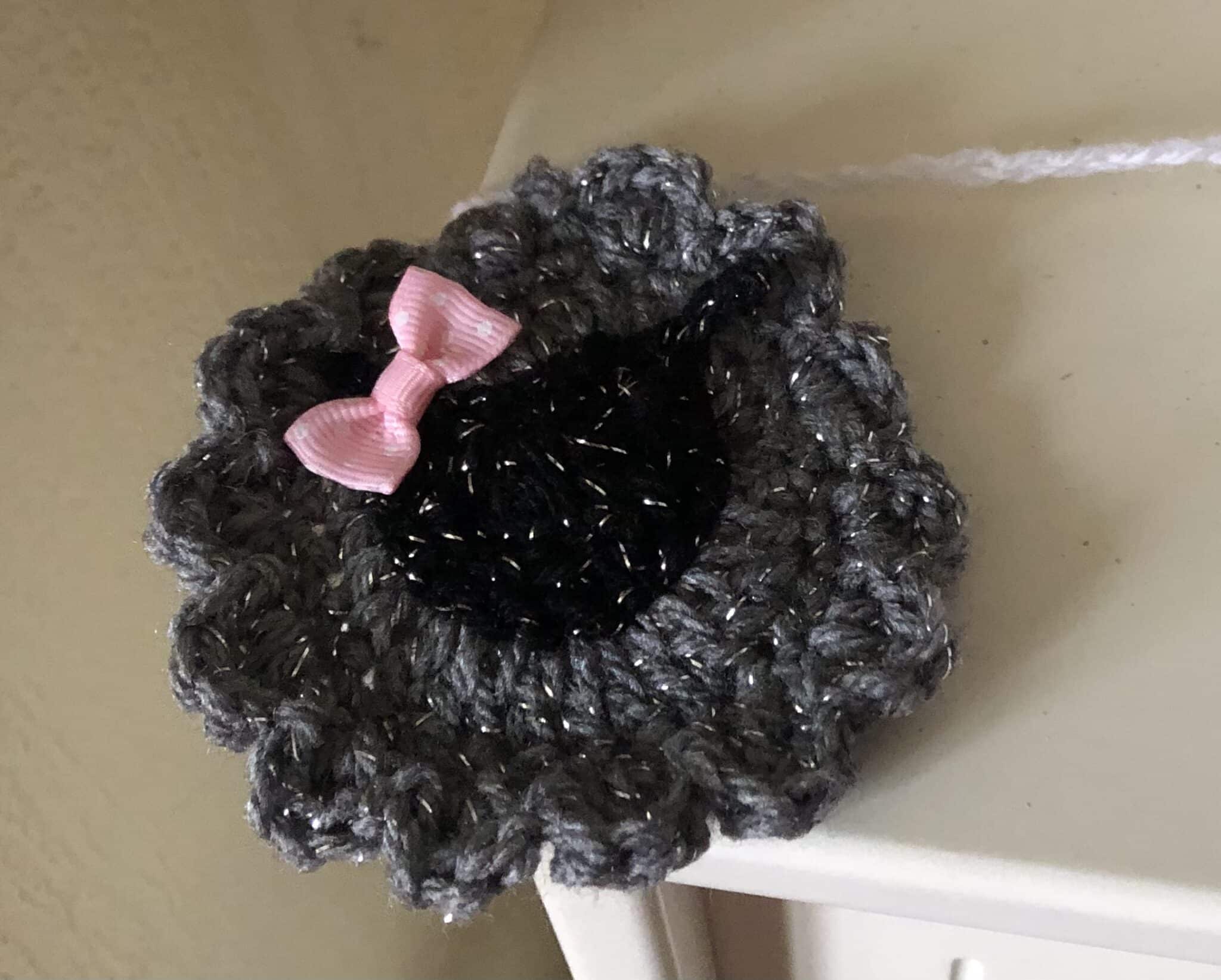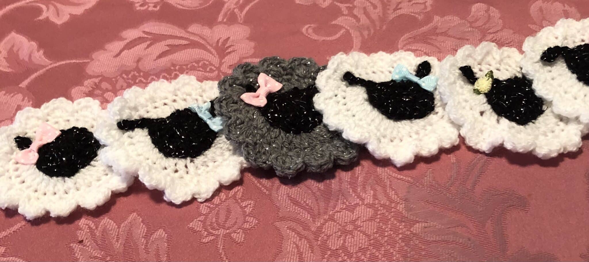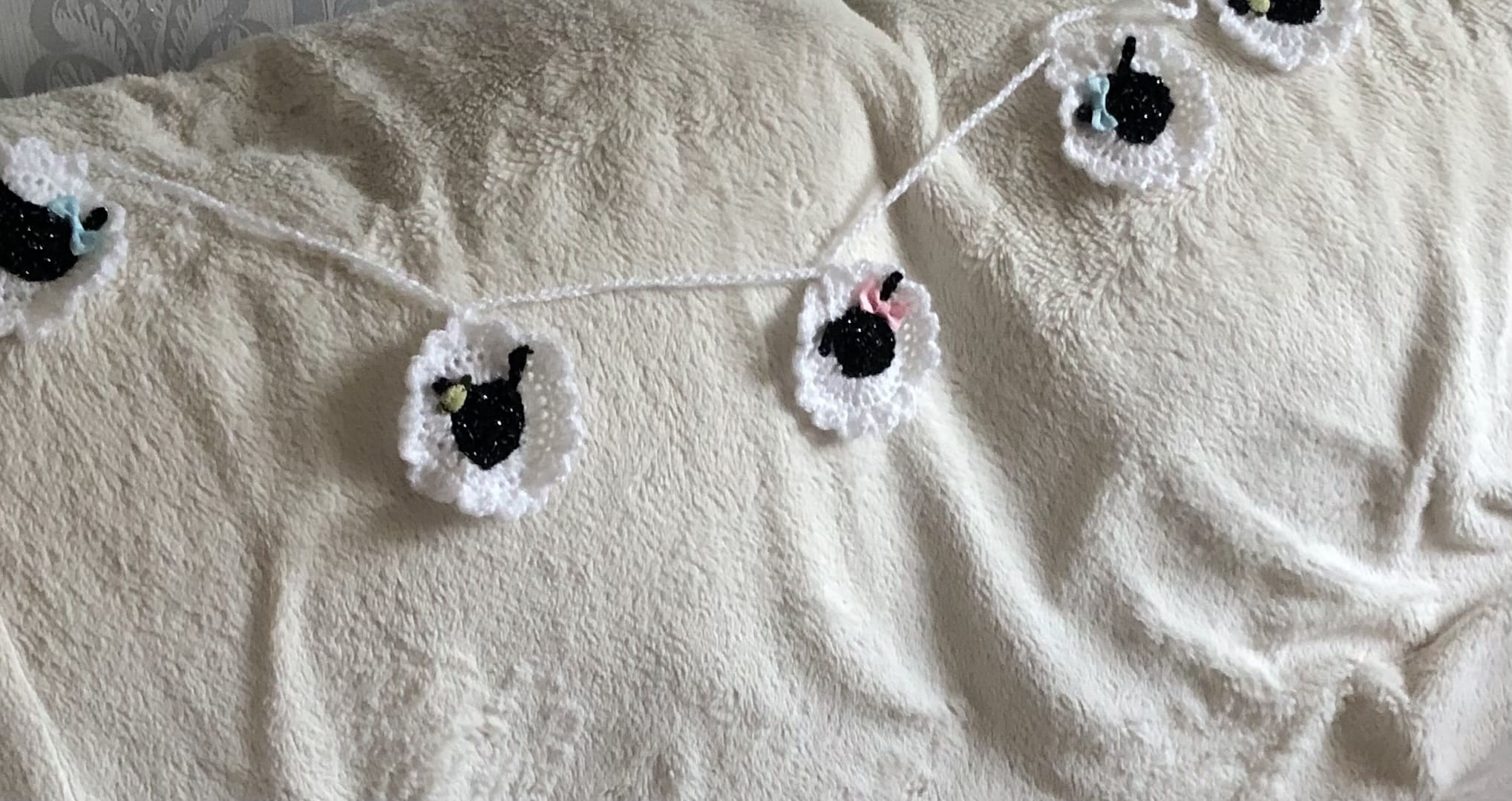Easter lamb crochet bunting on a seven foot (220metres) hanging chain.. each head is adorned with either a cute little bows or flower.. bunting contains 10white sheep with black sparkling faces and 1brown and 1 grey (12) in total.