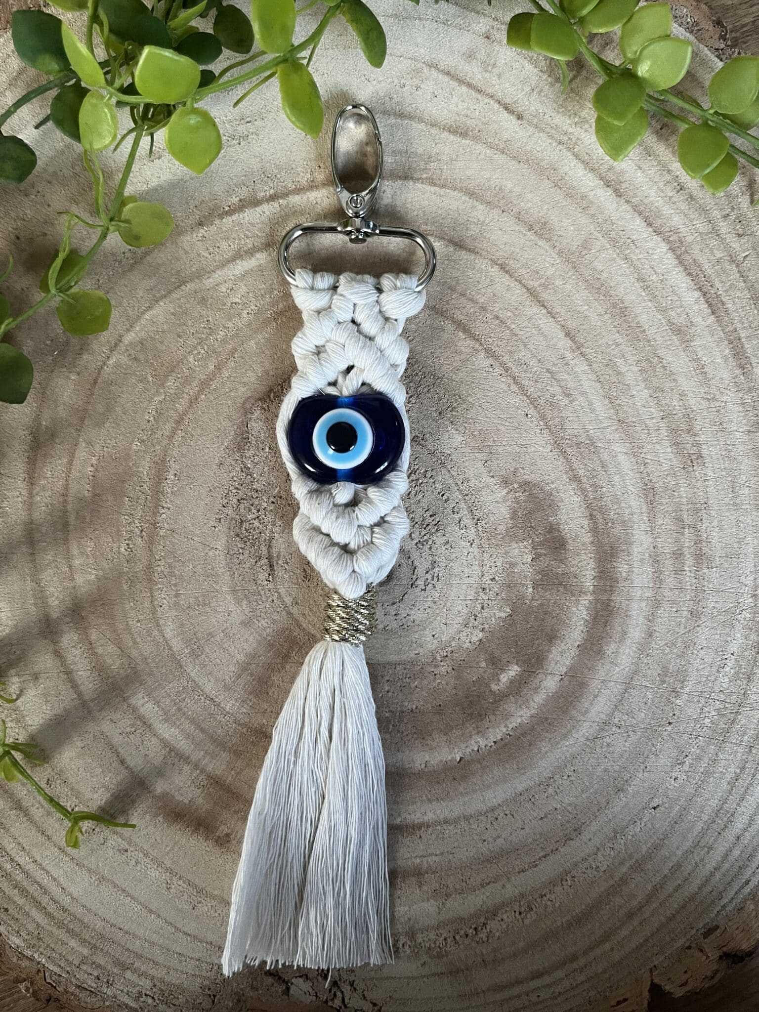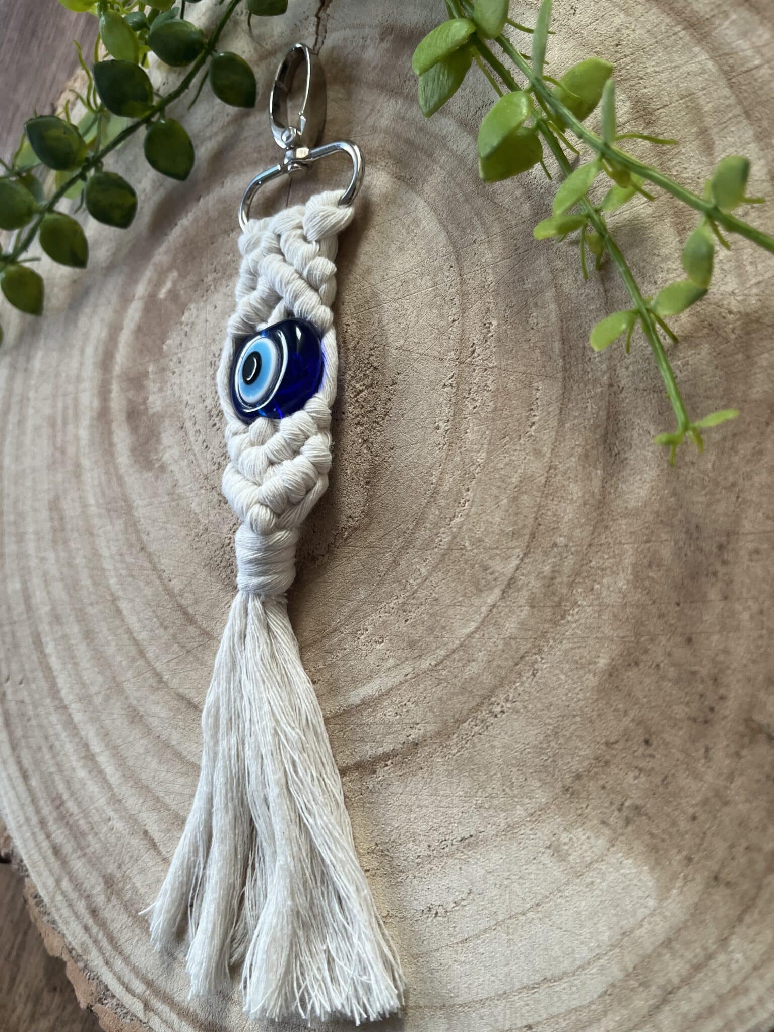 Handmade keyring using beautifully soft, eco friendly, recycled cotton cord in natural, on a metal clasp, with resin Evil Eye bead.