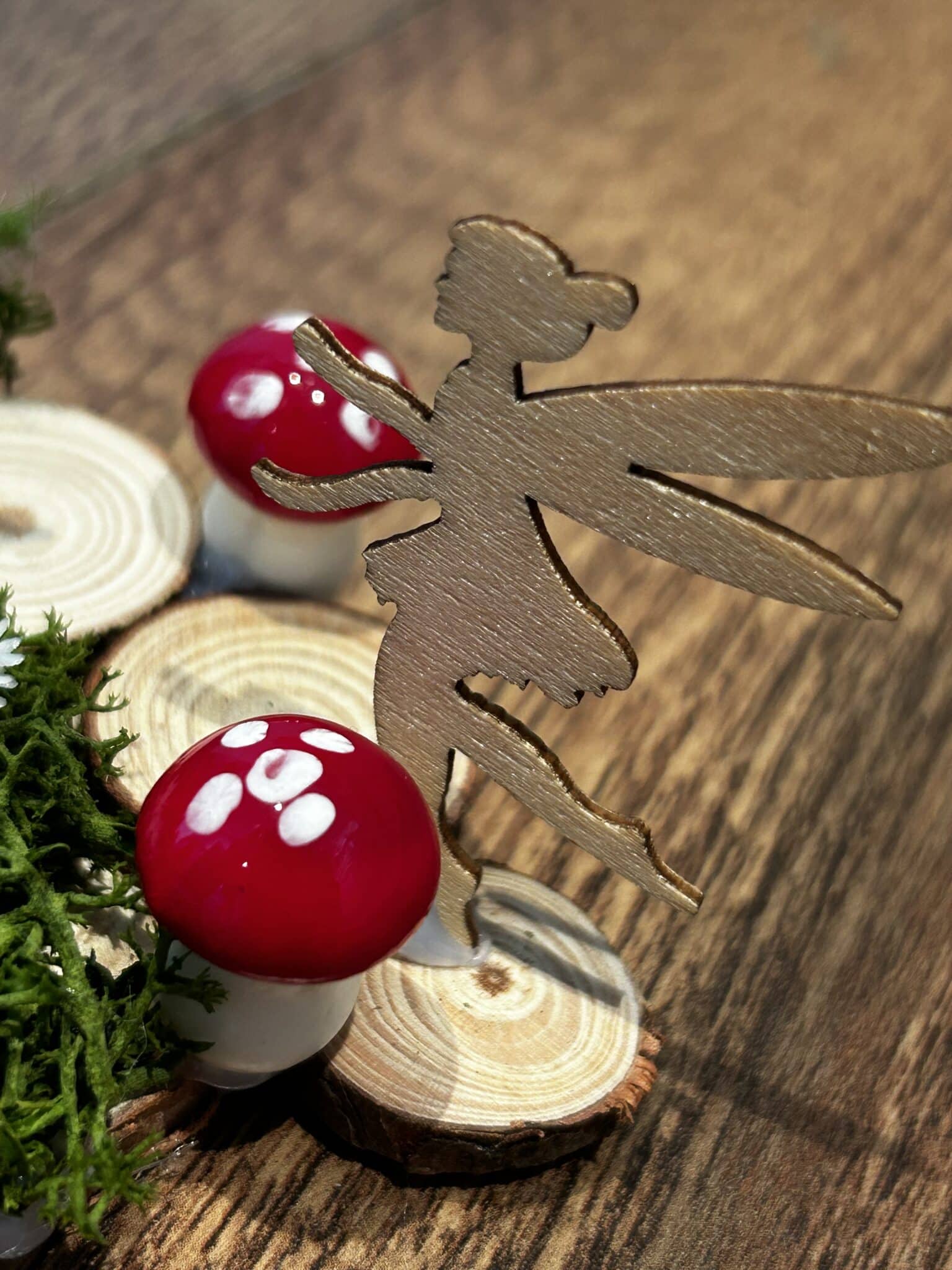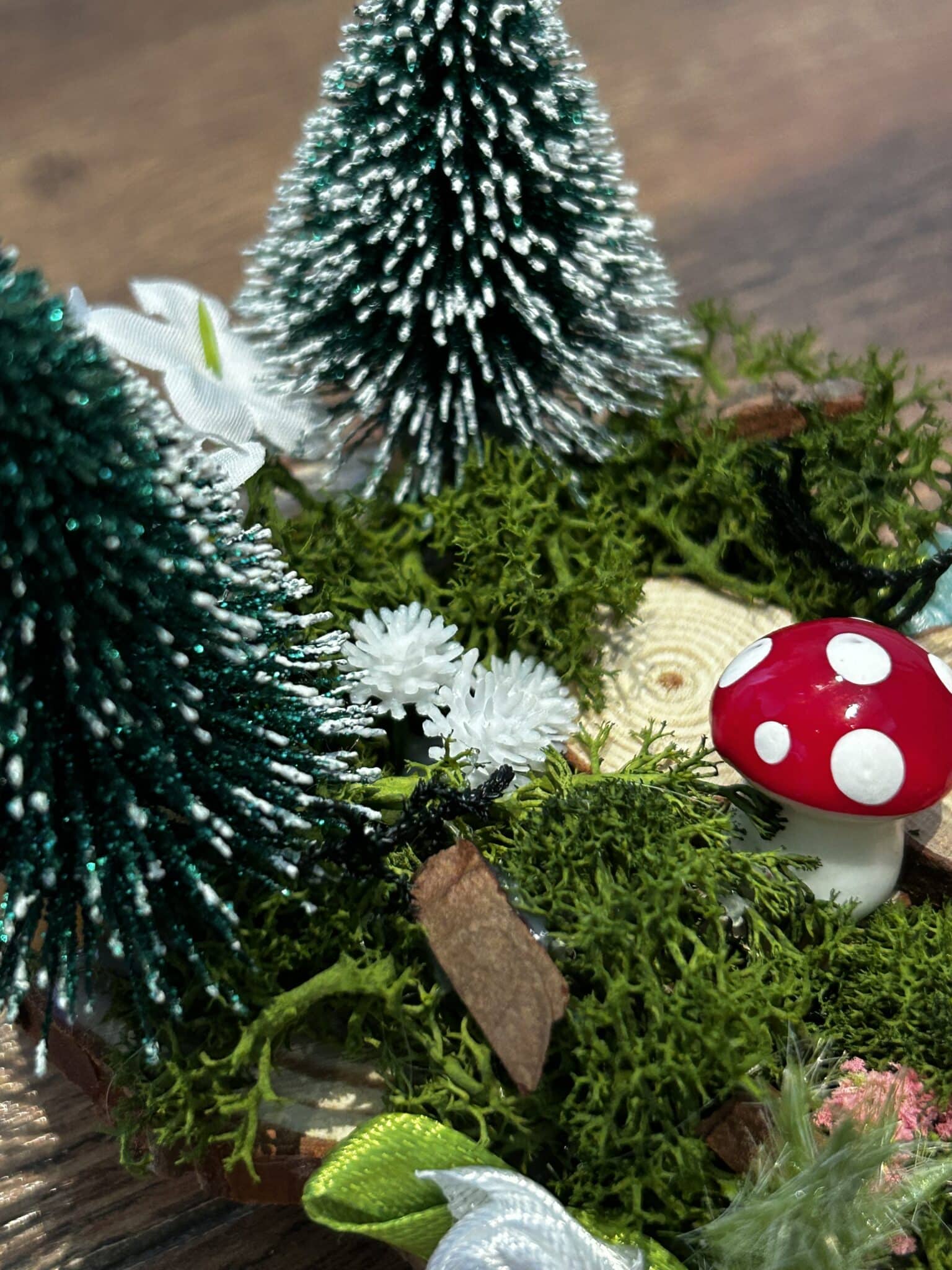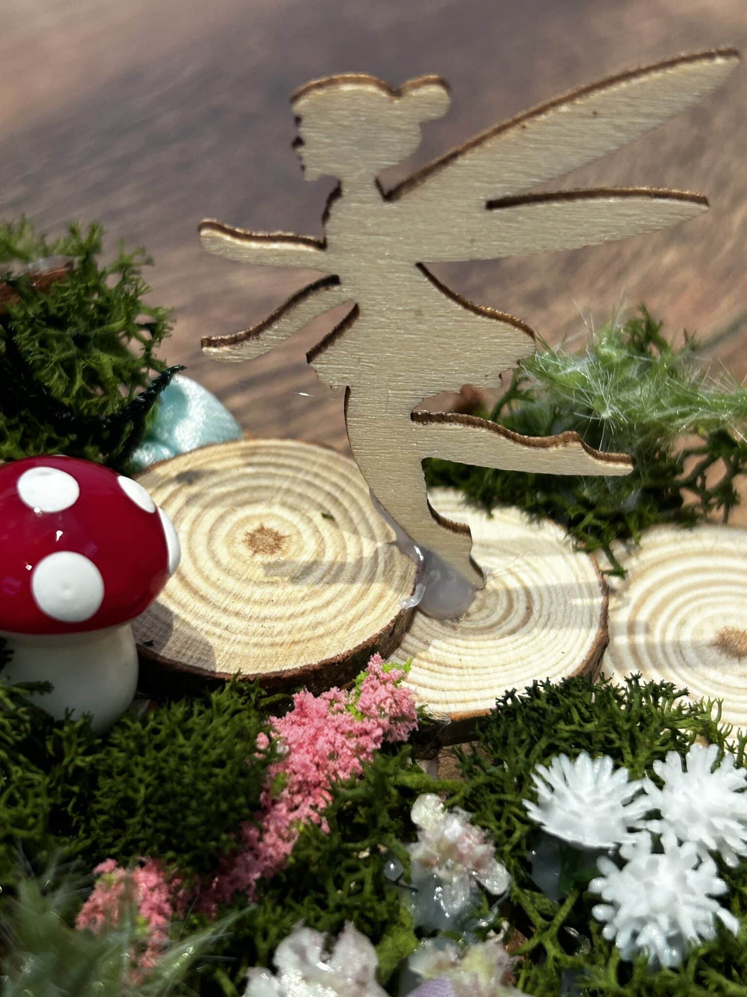 This fairy forest is made up of 3 wooden log slices for the base with smaller wooden log slices for the steps. It is accented with many different things. Miniature trees that have a nice shimmer as well as some red mushrooms, 2 small wooden fairies, bark, different coloured flowers, ferns and some moss to fill in the gaps.