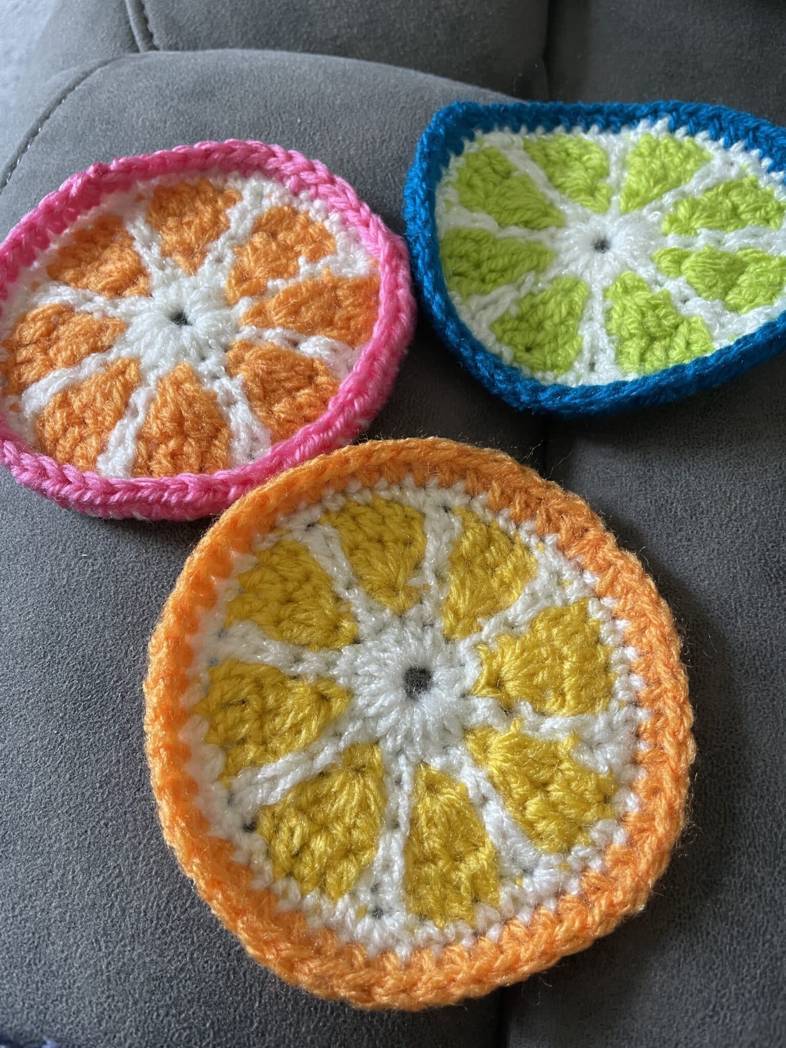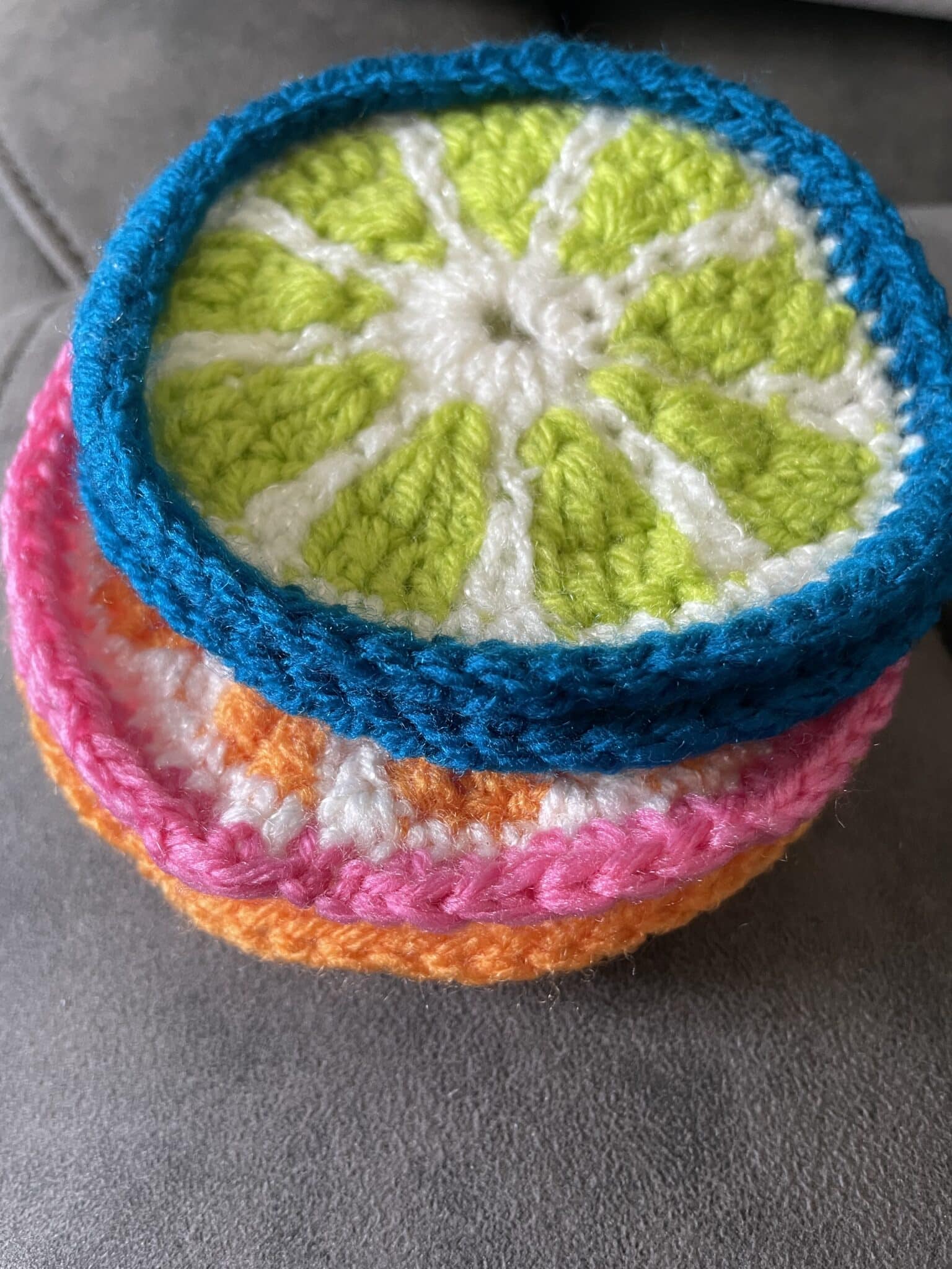 Pep up your garden parties and summer days with these colourful drink coasters in 3 fruity crochet designs.. 6 in a pack.