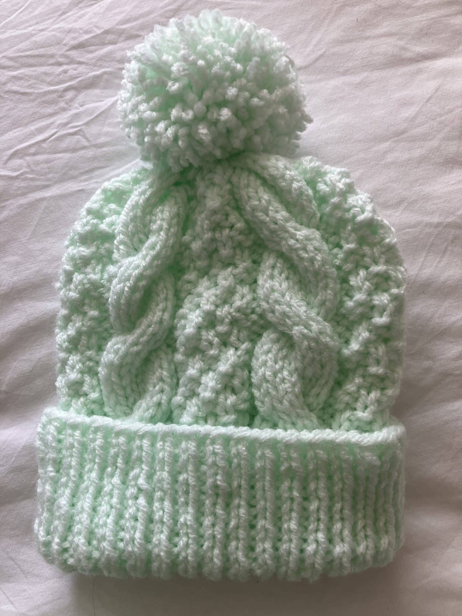 Hand knitted in baby Aran cable and moss stitch sets, I have pink, mint green and blue available.