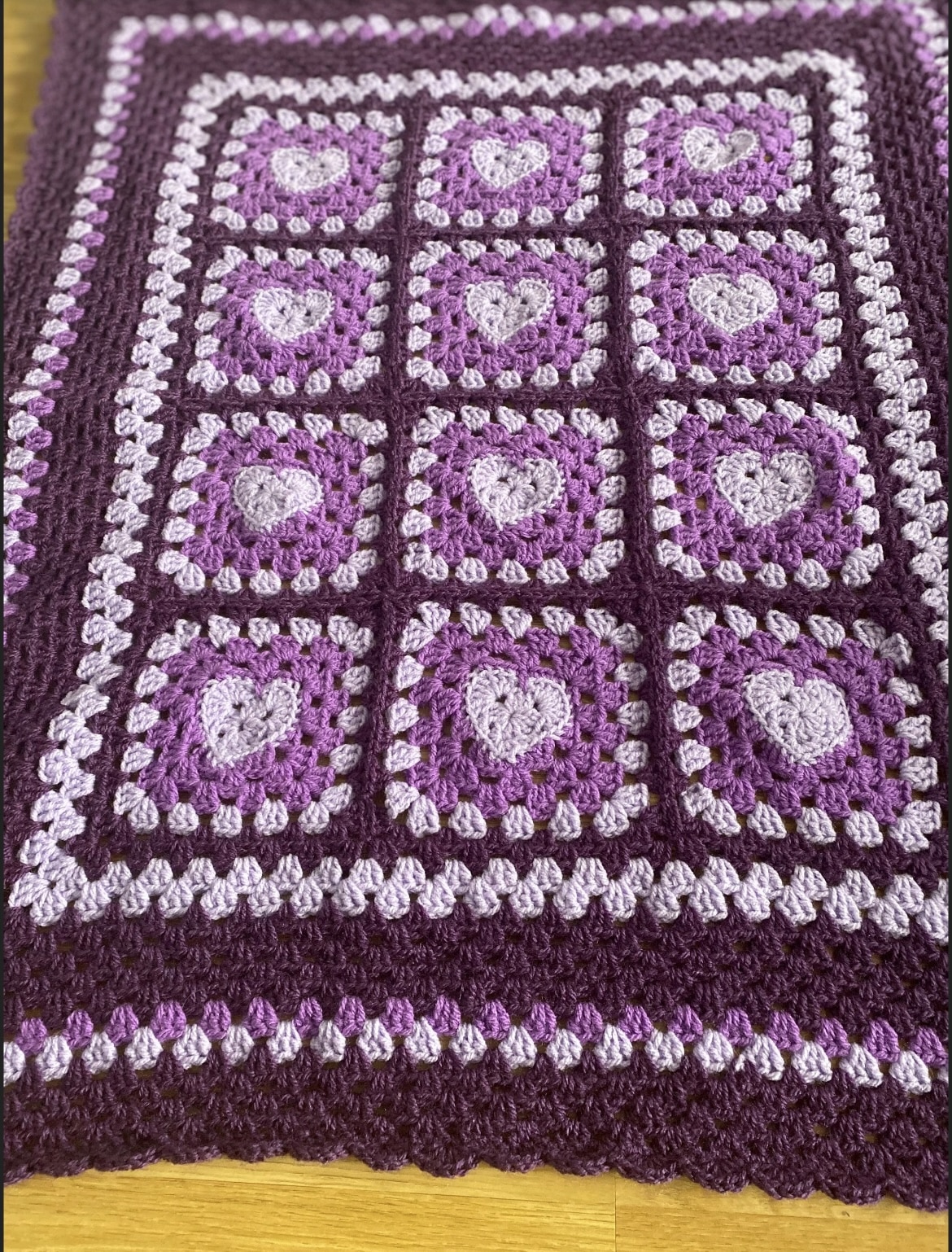 This features 12 small squares with heart detail to the centre, all joined in deep purple.