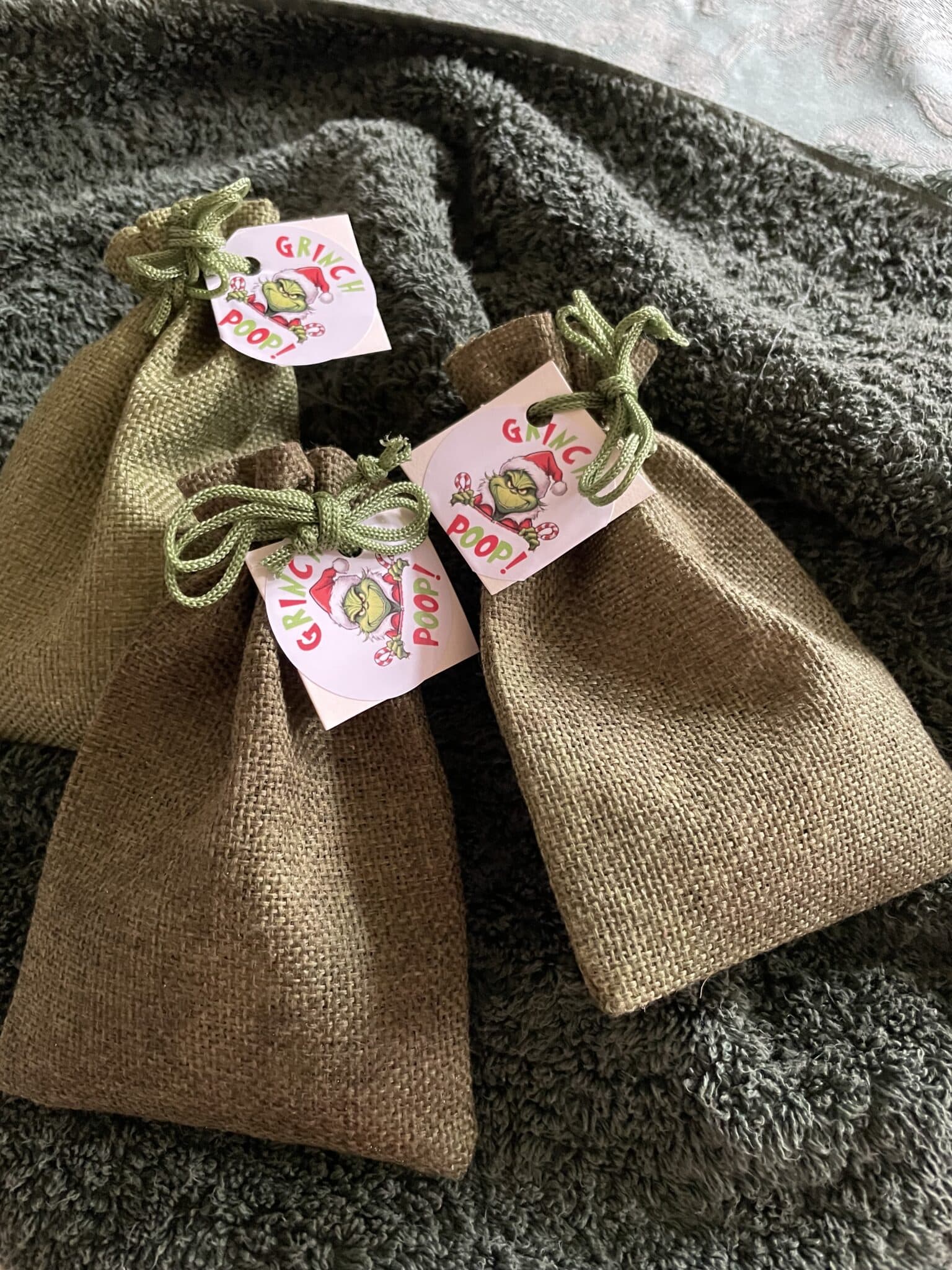 Grinch Poop packed into a green hessian burlap bag for little fingers to dip into . A 2oz bag containing dried fruit, popping candy, green apple sour tik tak sweets, and soft jelly sweets. A novelty item for the Christmas Eve box coming in a green hessian bag for all those who love Grinch. Bah humbug!