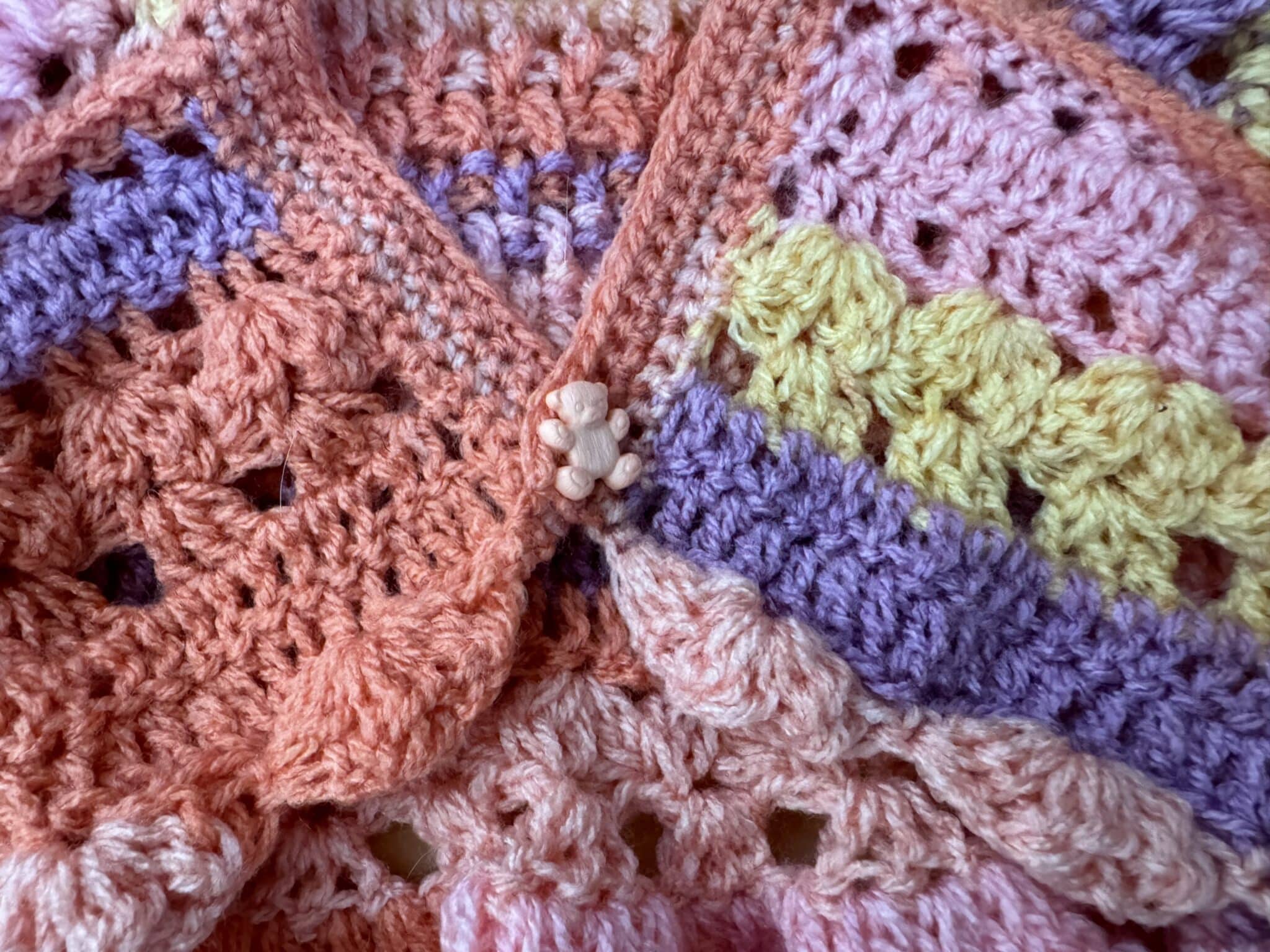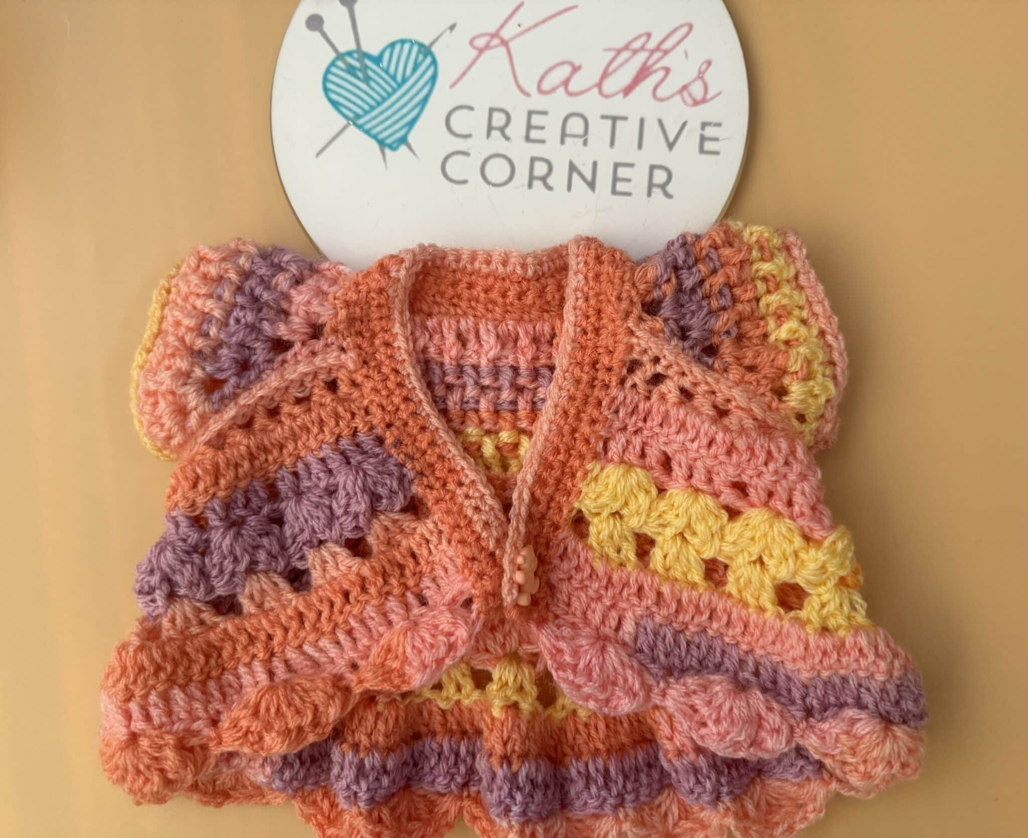 Hand Crocheted Shrug made in beautiful shades of peach,pink,lemon and purple ๐๐๐งก๐ acrylic yarn and completed with matching cute button.
