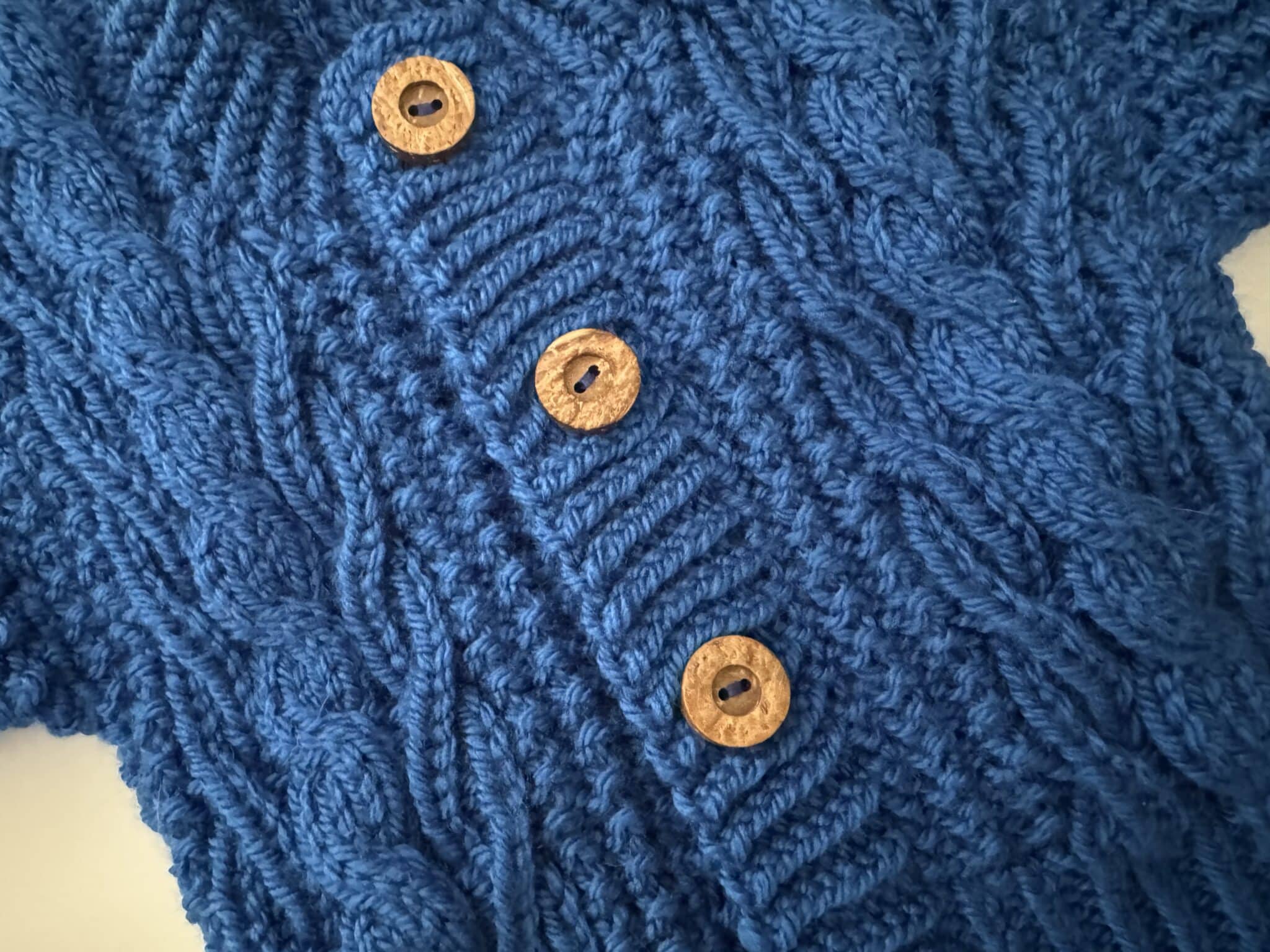Hand knitted Baby aran cardigan, made in a gorgeous shade of blue acrylic yarn and finished off with cute buttons.