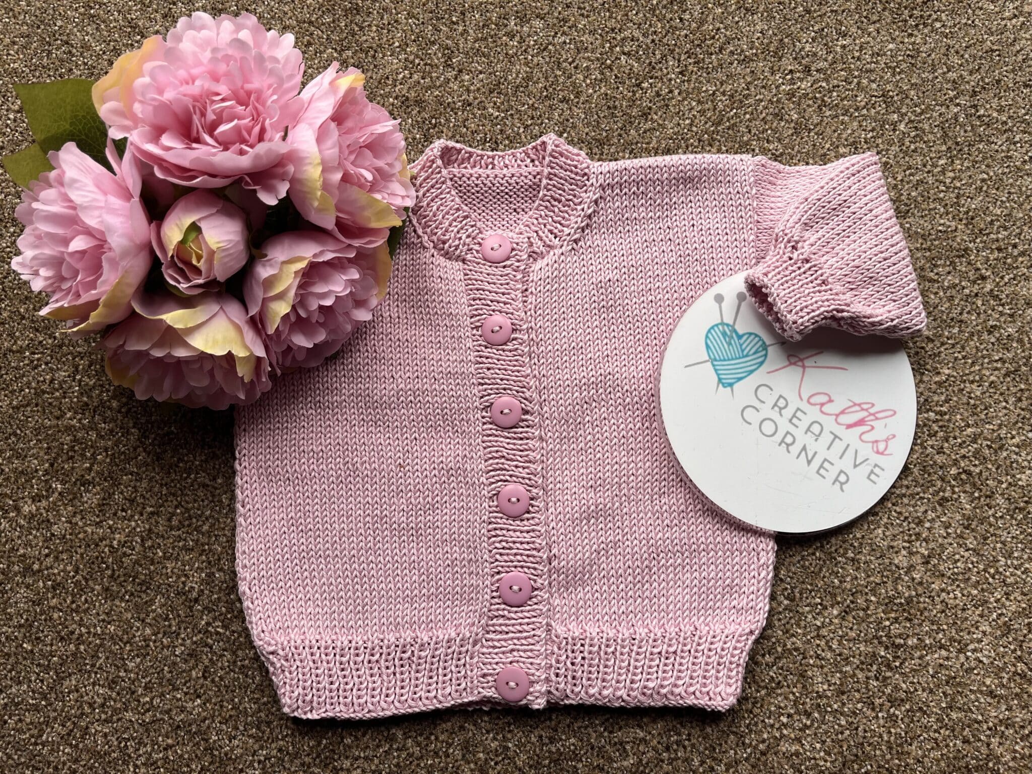 Hand knitted cardigan made in soft washable cotton and matching buttons with name embroidered on the back