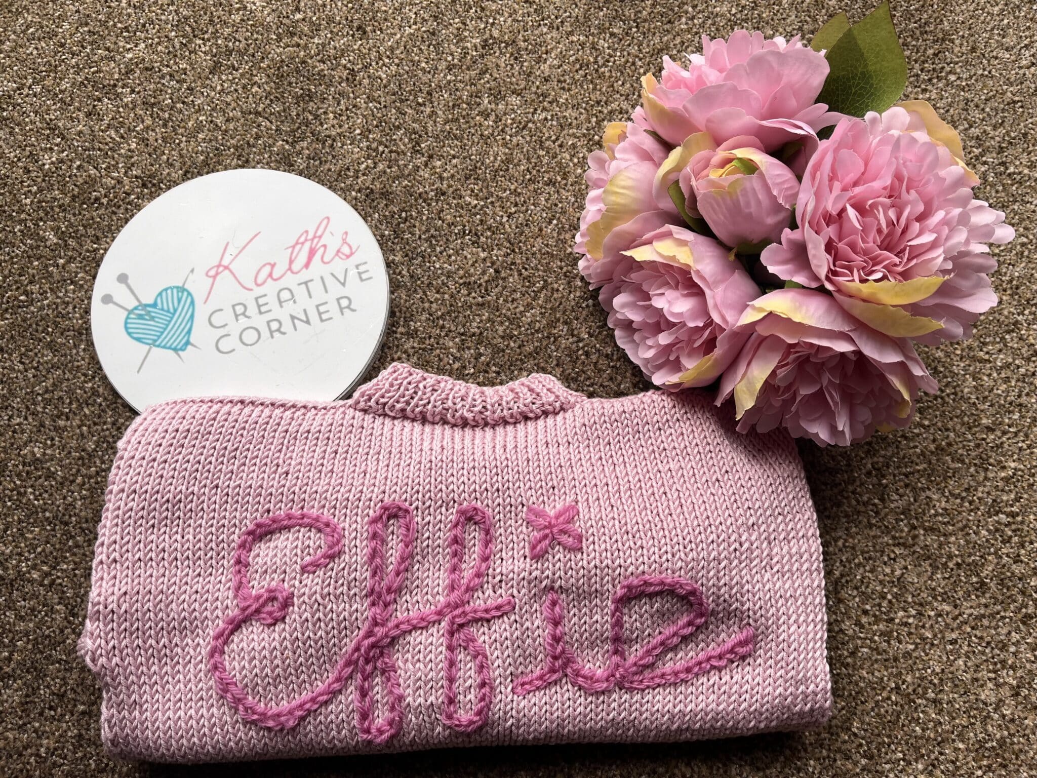 Hand knitted cardigan with embroidered name – Made to order