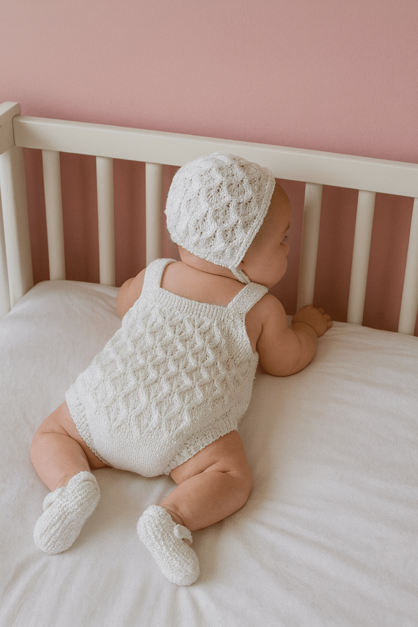The romper is a pull-on style with straps. It is in the ever-popular leaf lace stitch which is repeated on the bonnet. This ties with two knitted i-cords.