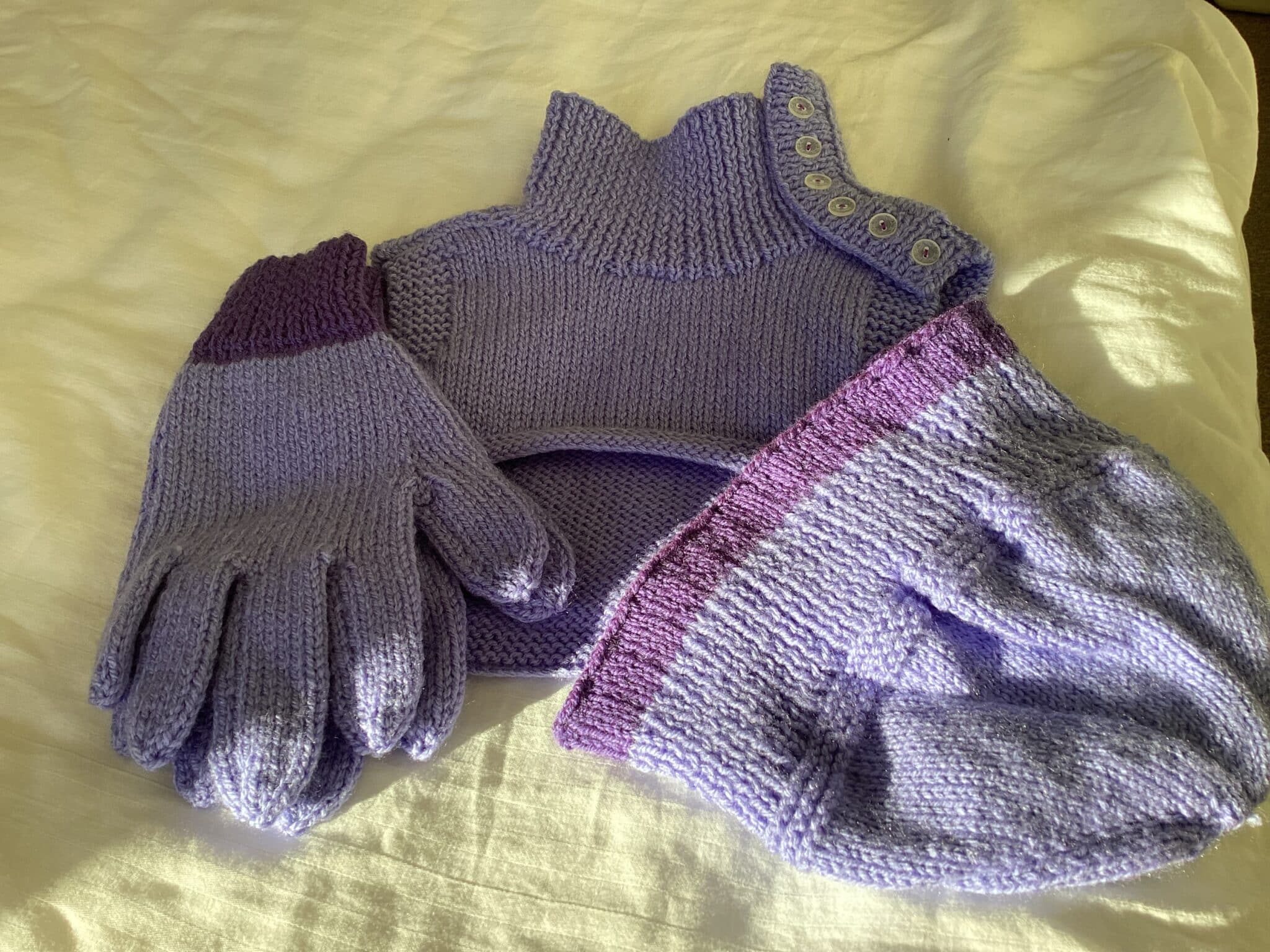 Hand Knitted gloves hat and neck warmer set, Adult size, made in acrylic so machine washable.