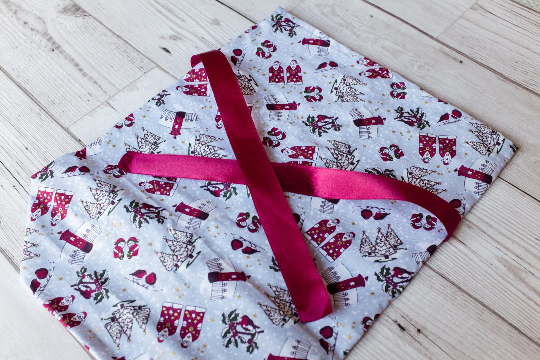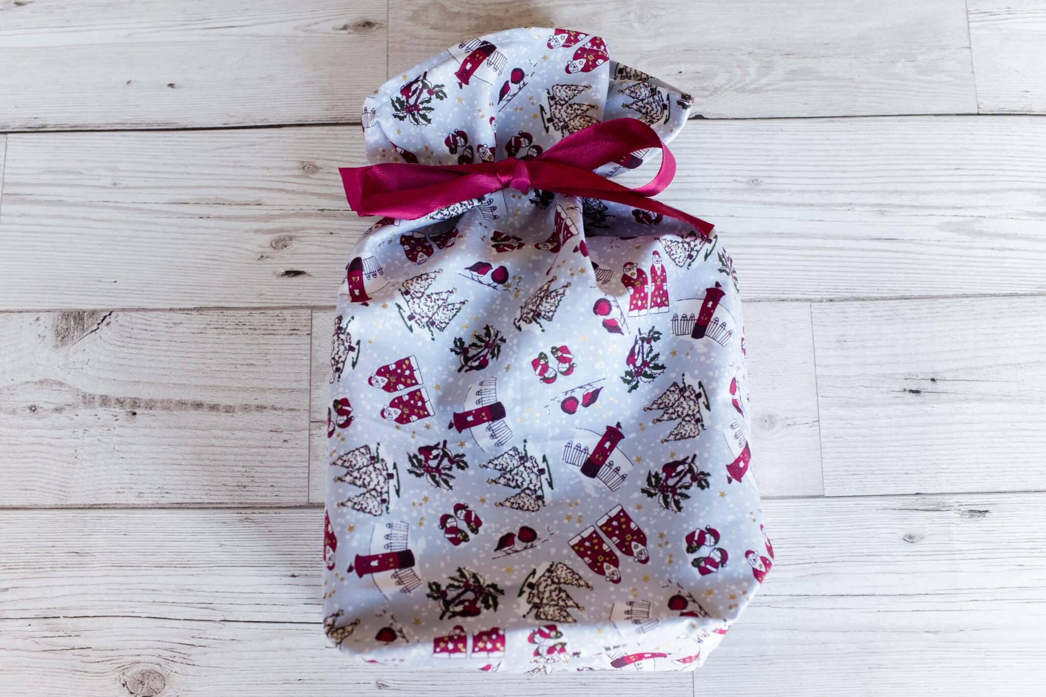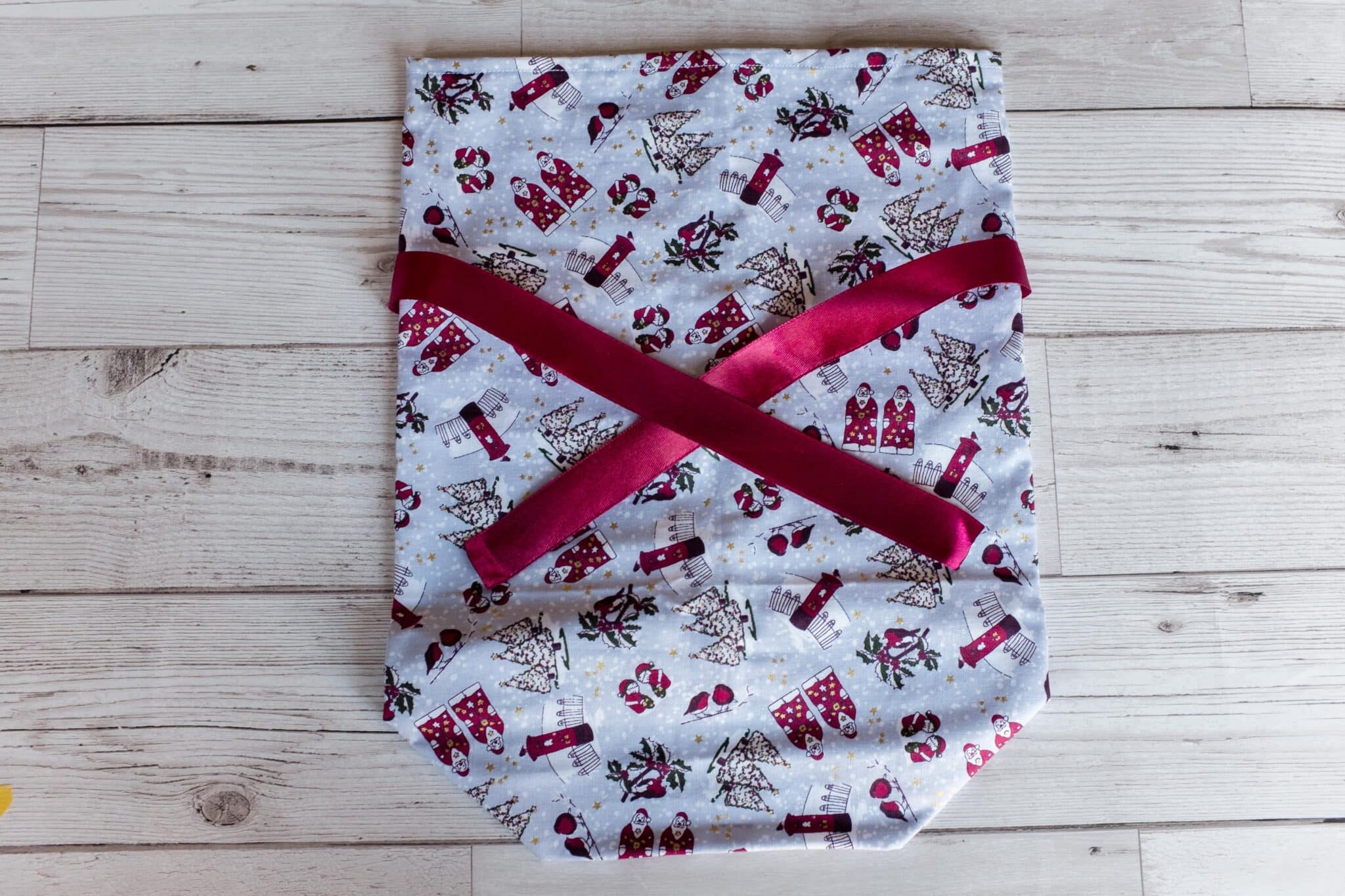 Beautiful handmade fabric gift bag. The bag you get is in the same fabric as the photo, with a ribbon attached for tying into a bow. The ribbon is attached to the bag so that it does not get lost and can be reused.