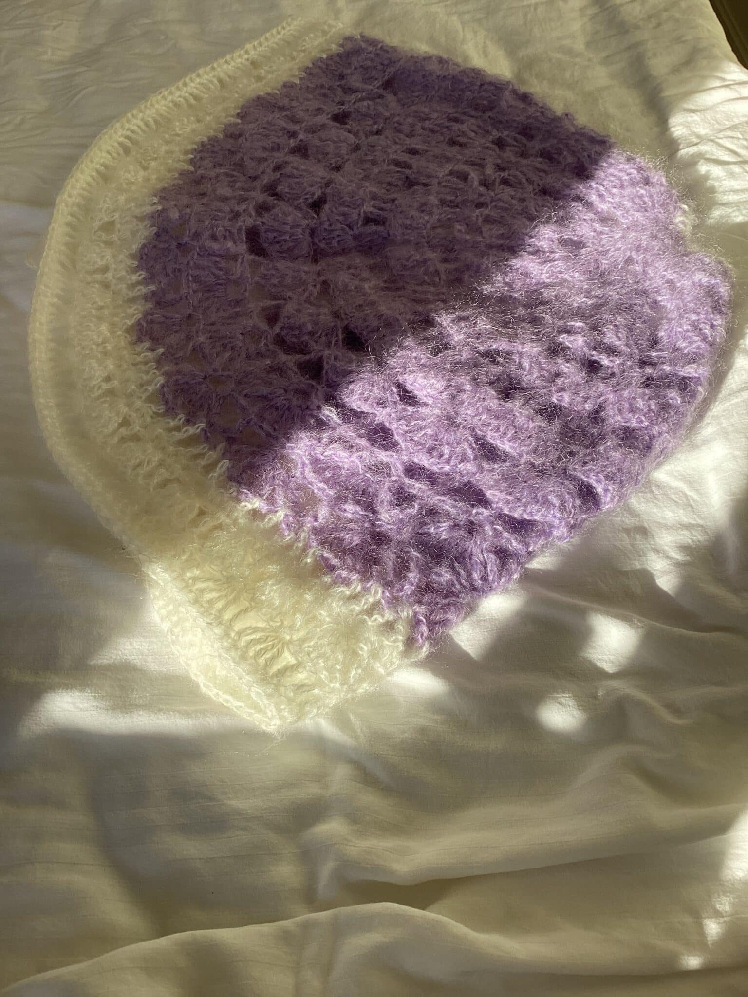 Beautiful and fluffy. Totally unique, crochet mohair shawl, so delicate wash only, size 22 x 50 inches. Lightweight.