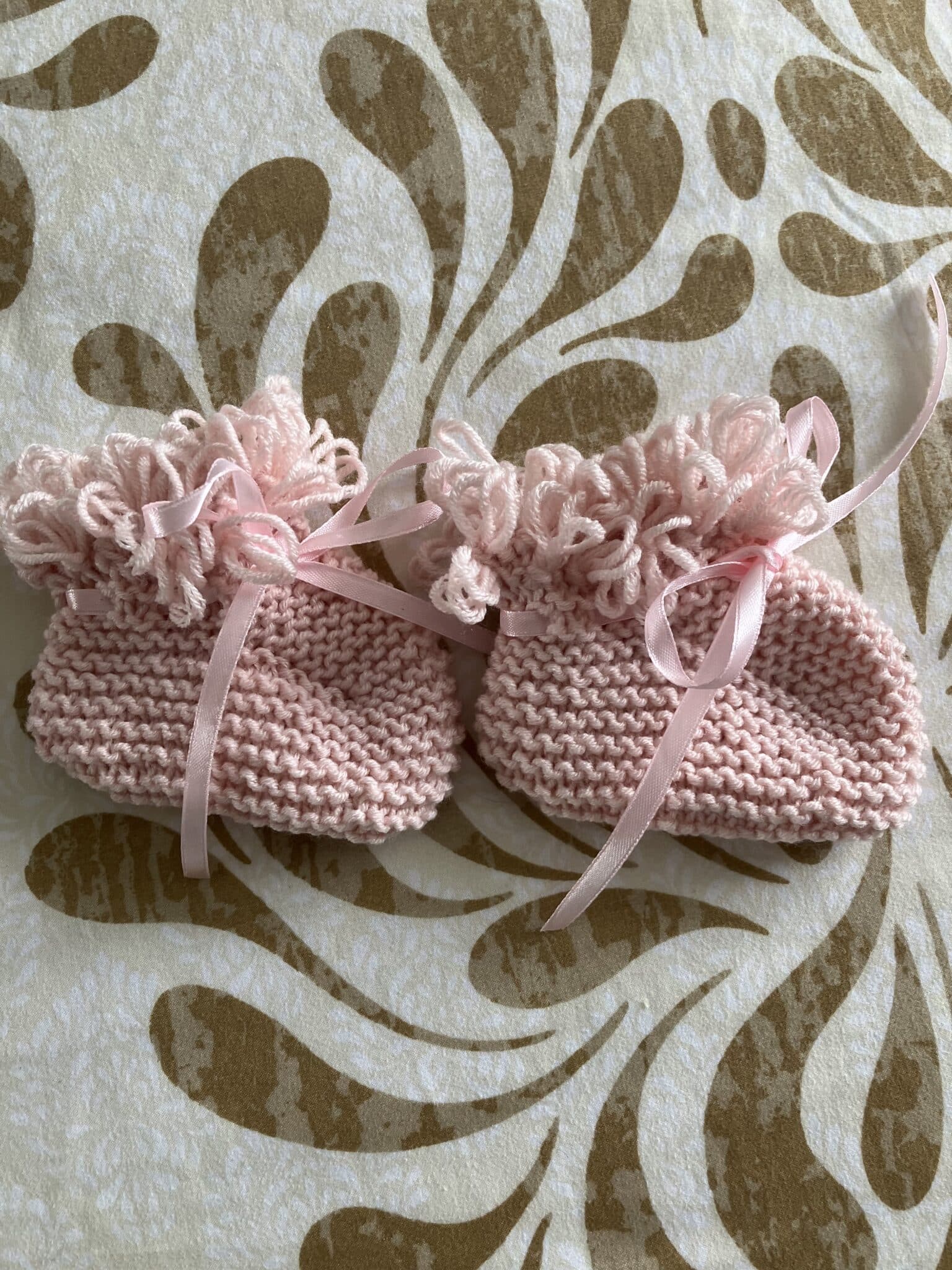Hand knitted in loop stitch with ribbed borders, I used very soft baby yarn for this 0-3 month cardigan. Hat and bootees with ribbon ties.