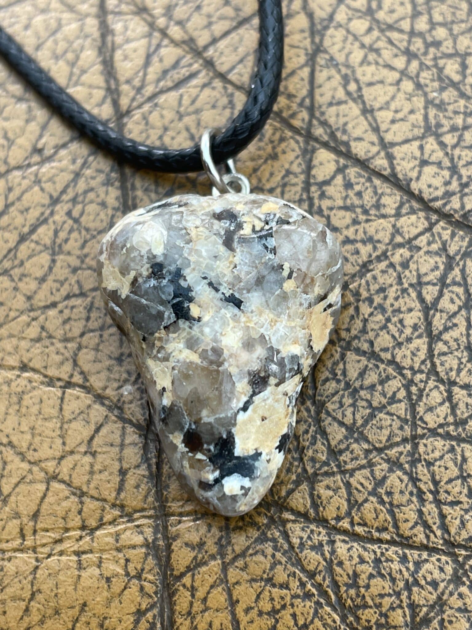 Cornwall Crystal GraniteThis very cute heart shaped Crystal granite leather cord and a SP leaf charm bail.