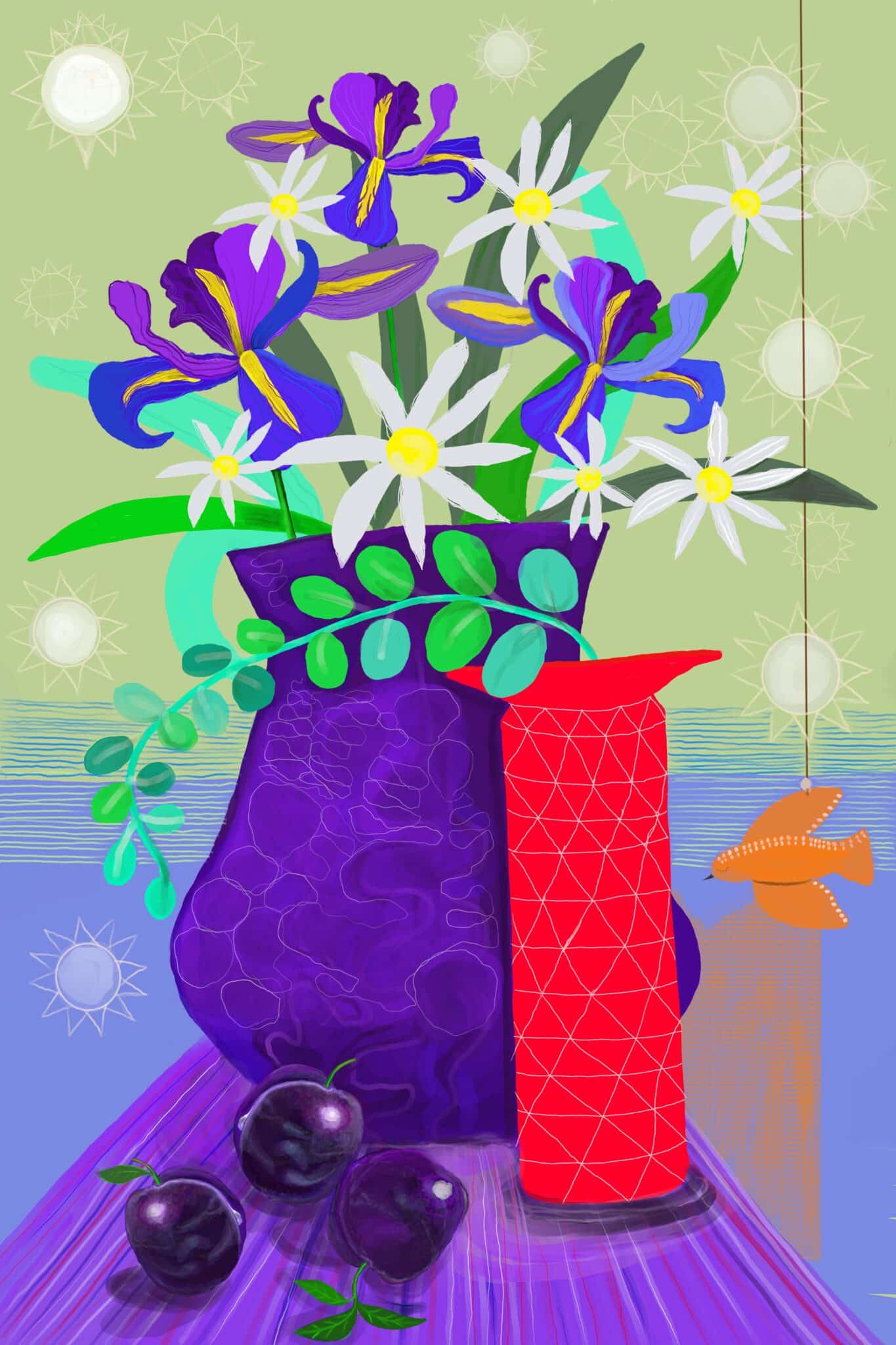 Still Life ART PRINT with Iris in vases by Lisa MacDonald. Colourful Wall Print Still life Art FLORAL Wall Decor for Kitchen, Dining Rooms and Gallery Walls