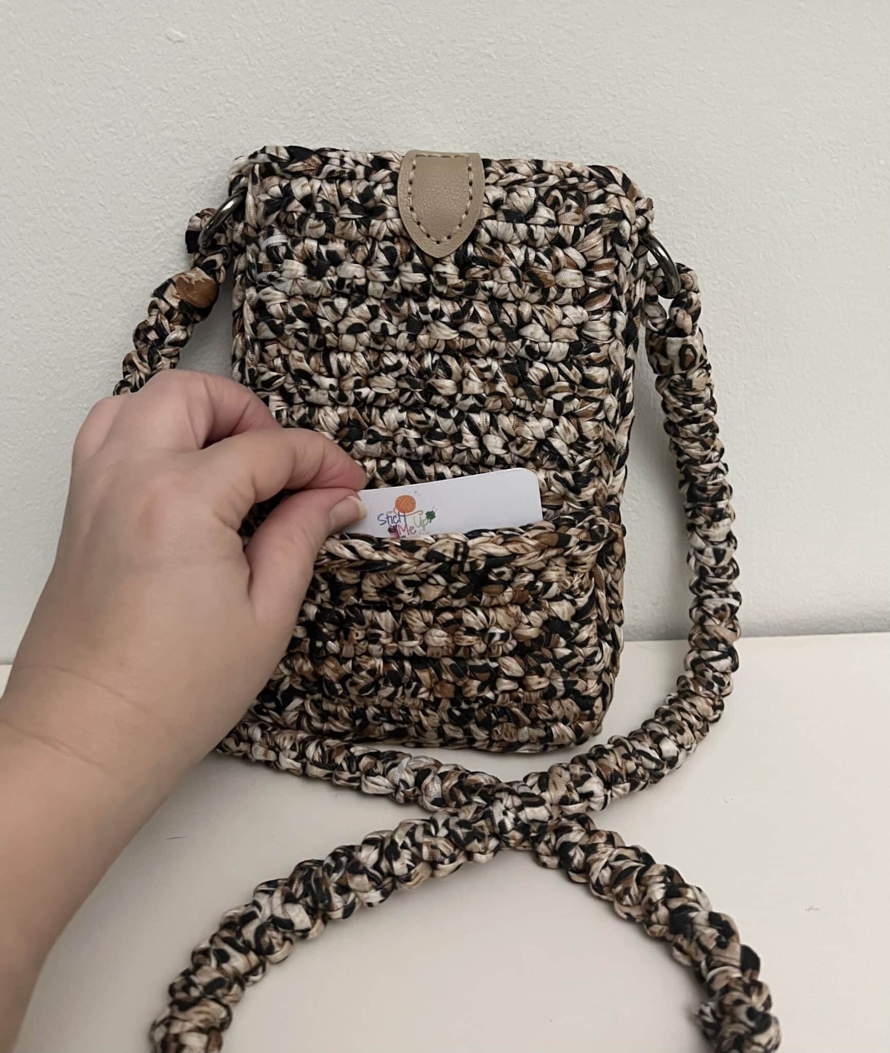 Leopard print cross body bag crocheted with recycled fabric yarn with small card holder attached at the back.