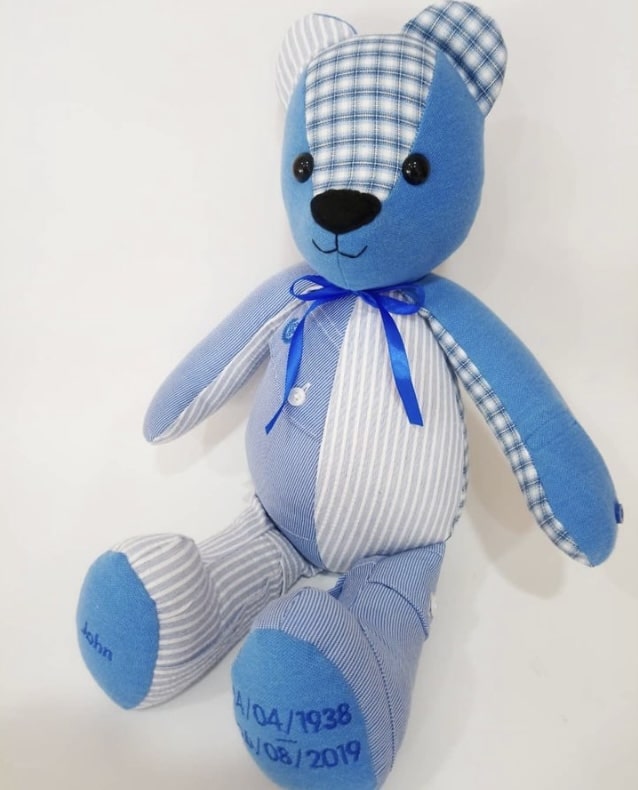 Our Luxury remembrance bears are made from loved ones clothing – the perfect way to remember a loved one who has passed. Instead of keeping clothing stored away in a box why not create a beautiful bear you can display and admire every day – add personalisation to the footpads for an extra personal touch.