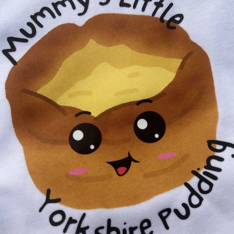 This adorable baby vest features the playful slogan “Mummy’s Yorkshire Pudding” in bold, fun lettering on the front with a cute Yorkshire pudding image.