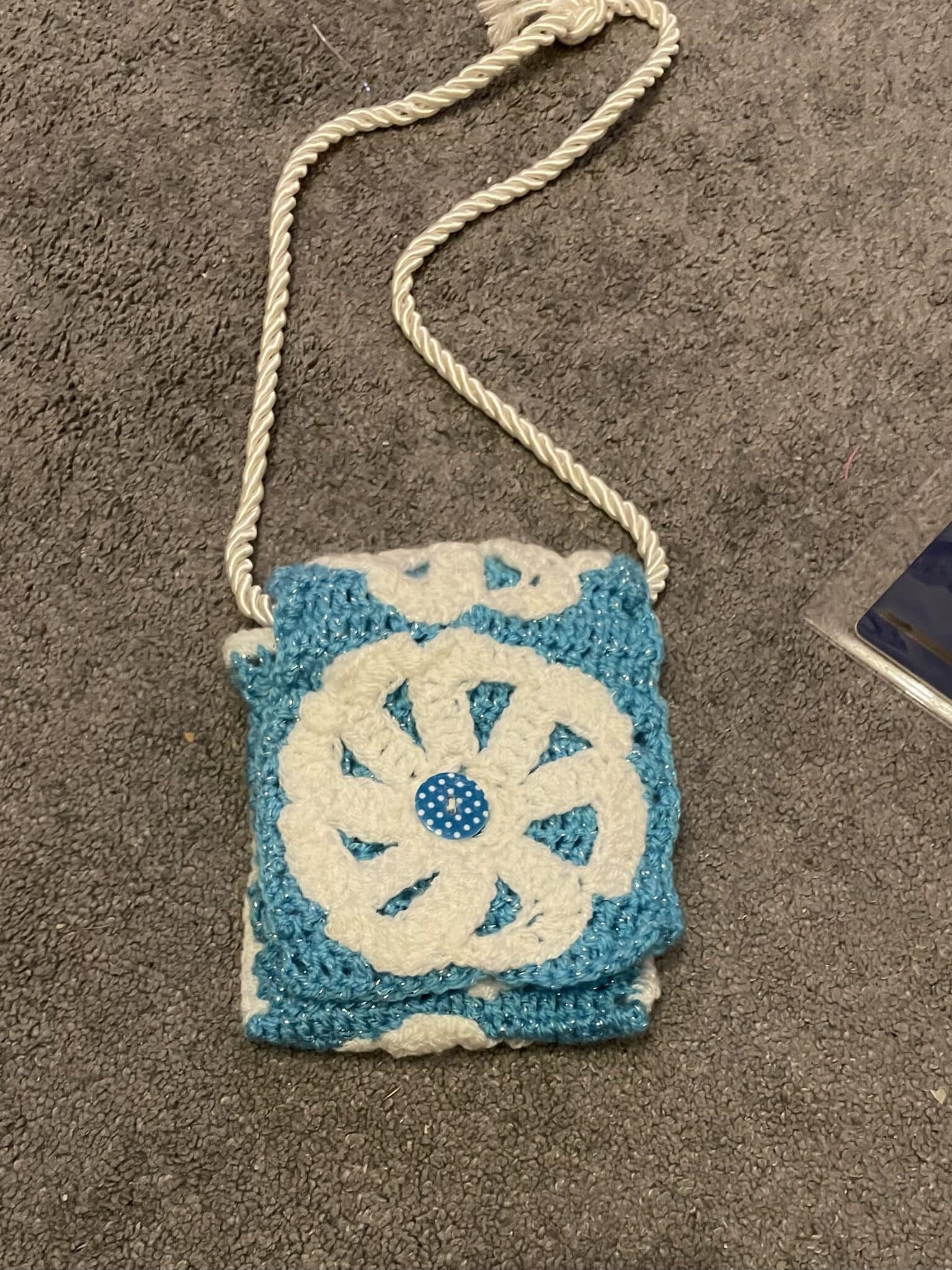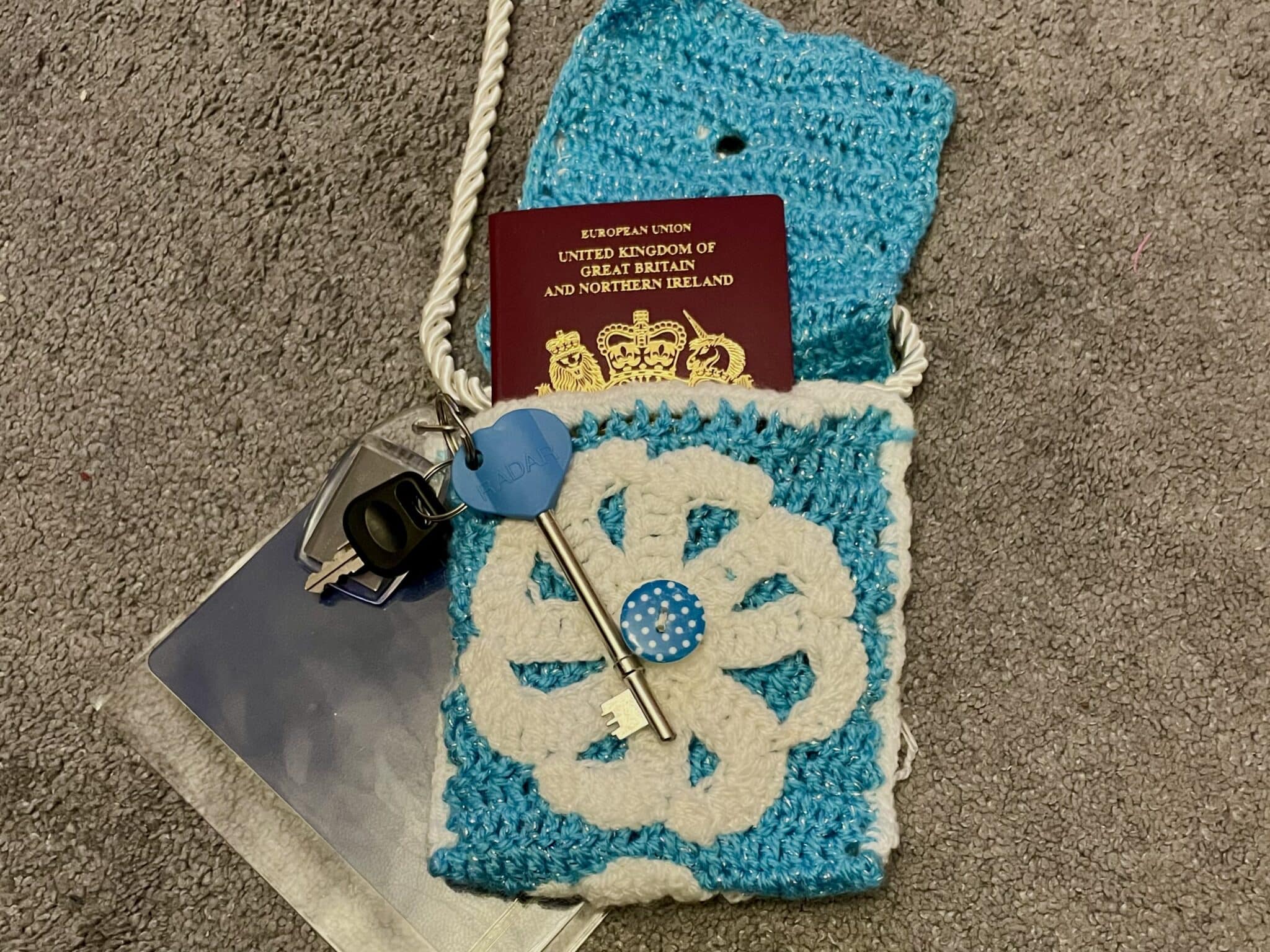 Crochet passport holder with a wheel print and a button fastener for the security of your passport.. Cross body corded strap. Holds one to 2 passports. Versatile use for passports or keys/lipstick emergency makeup or your quick fix first aid items