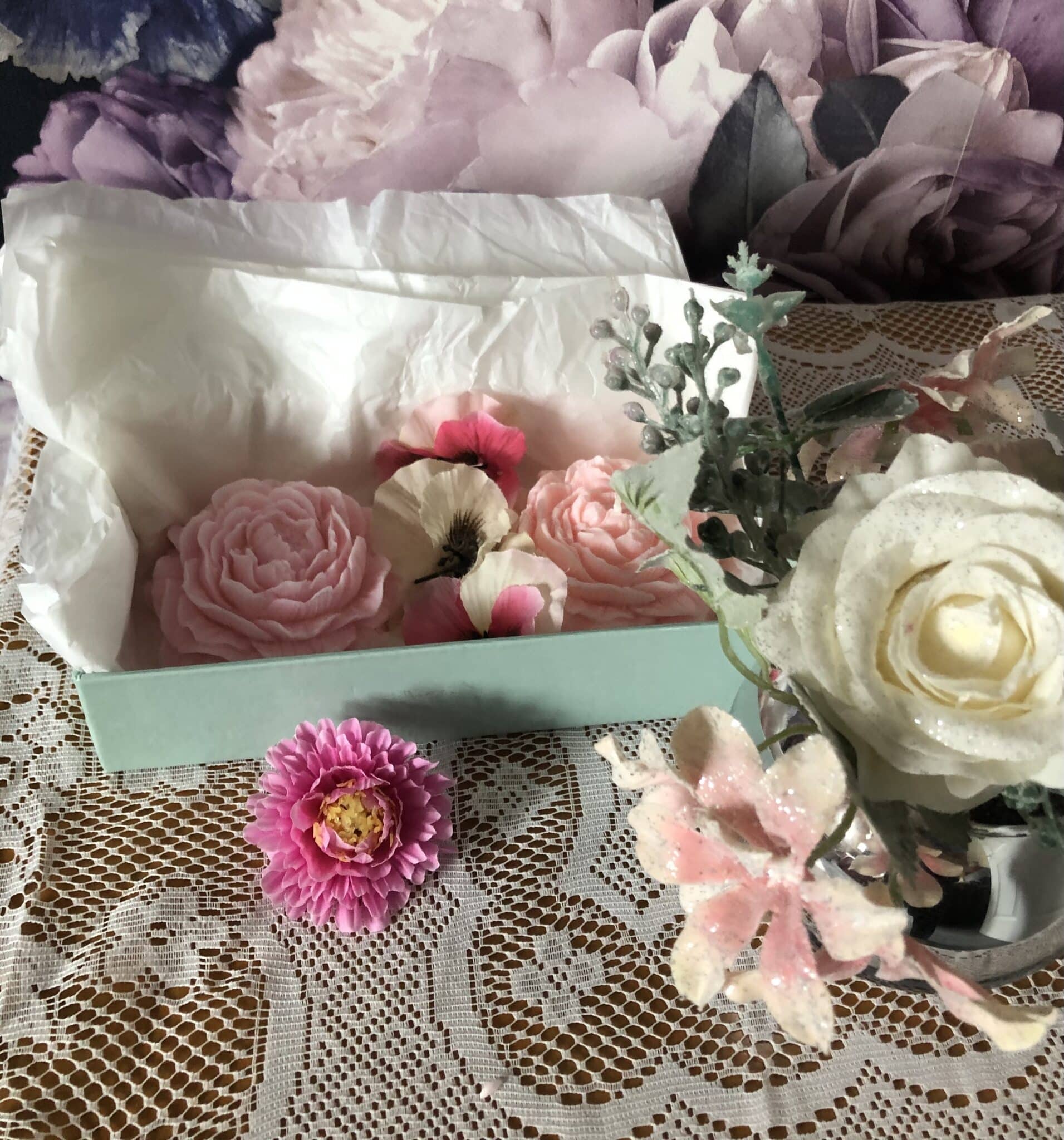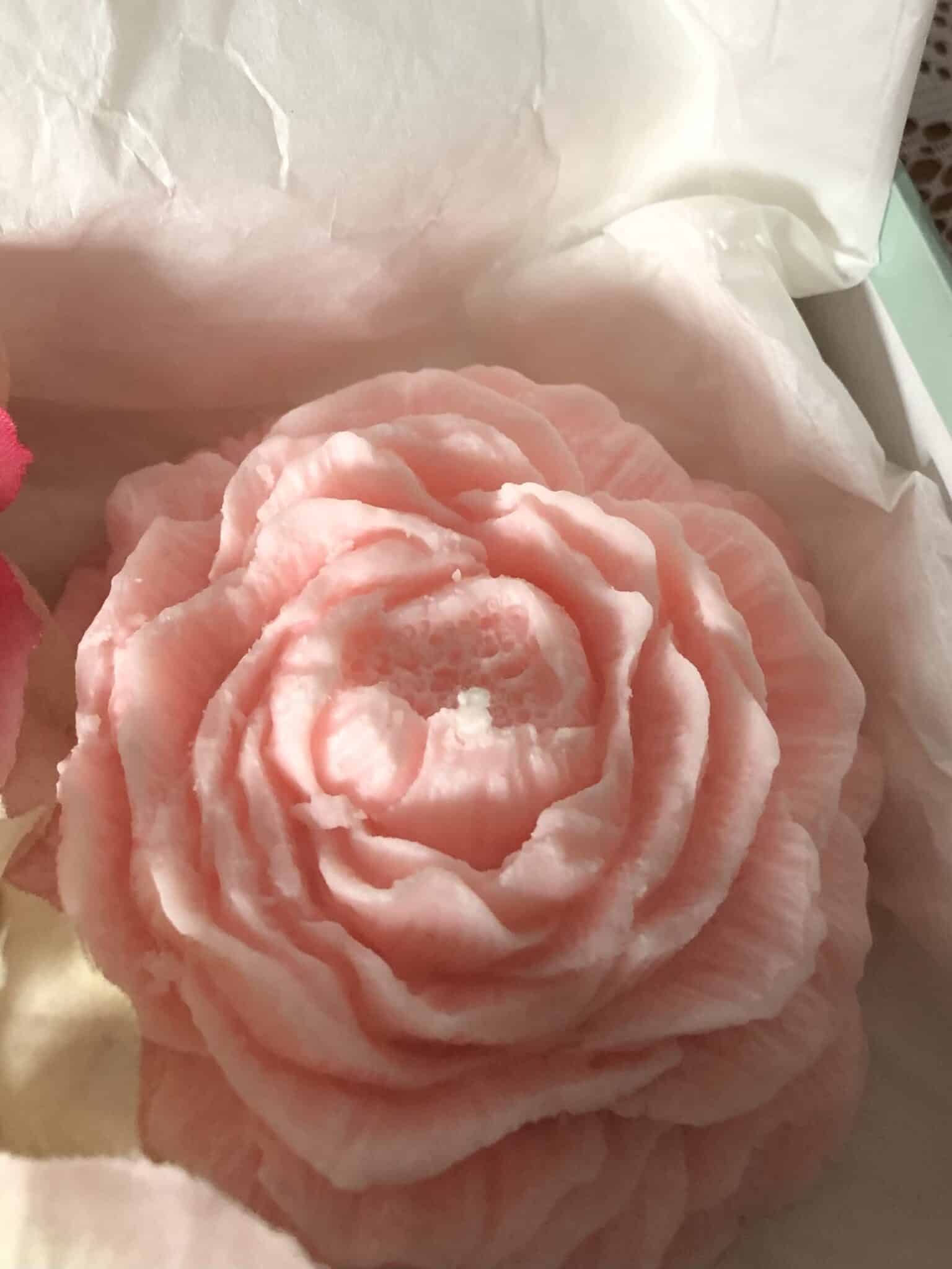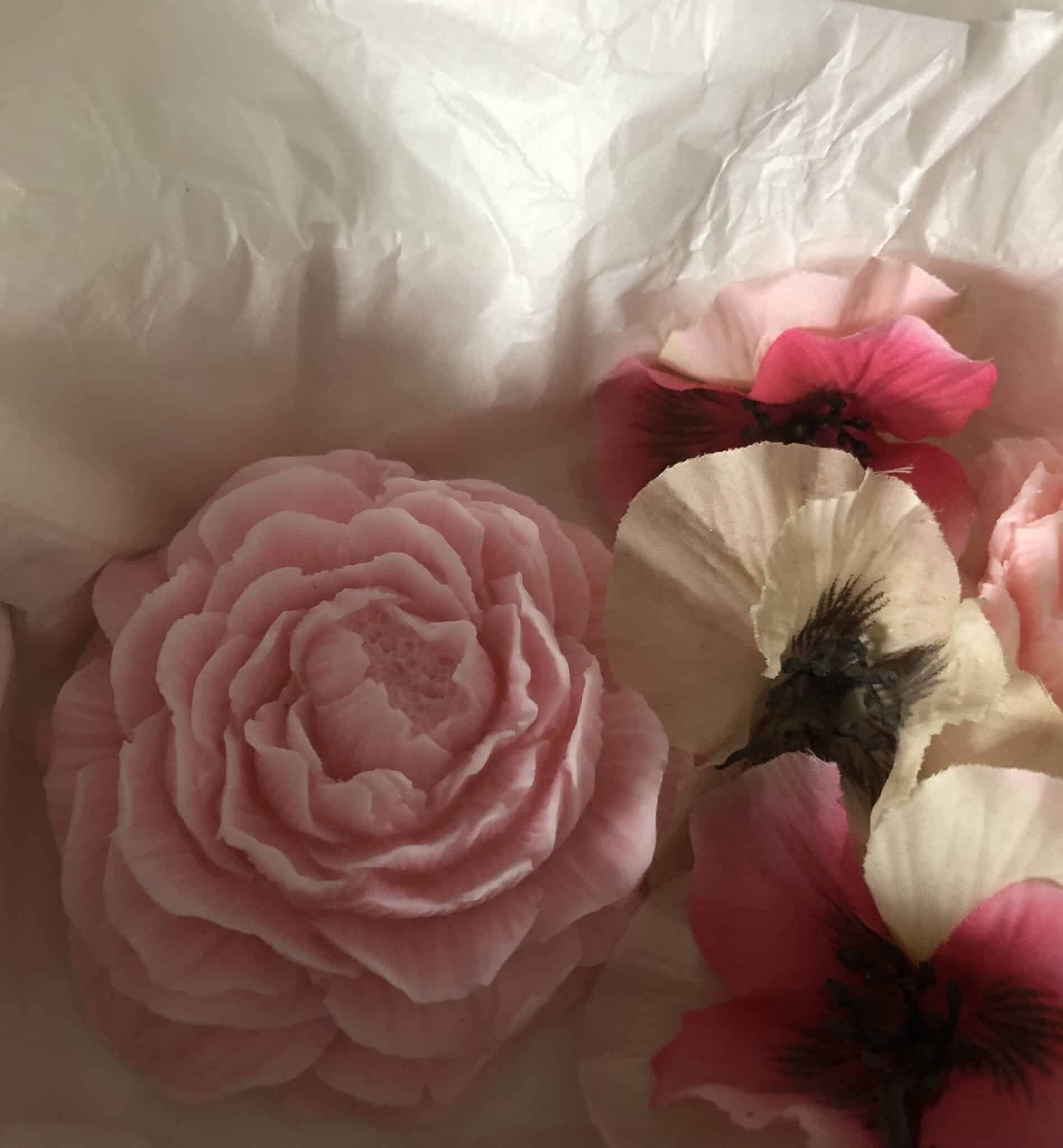A Delicate Peony flower of gentle goats milk soap hand crafted and containing essential oils of therapeutic Geranium oil, extracts of Vanilla Sugar and aromas of Peony oil and partnered with a peony shape flower candle making this a perfect duo and the height of femininity