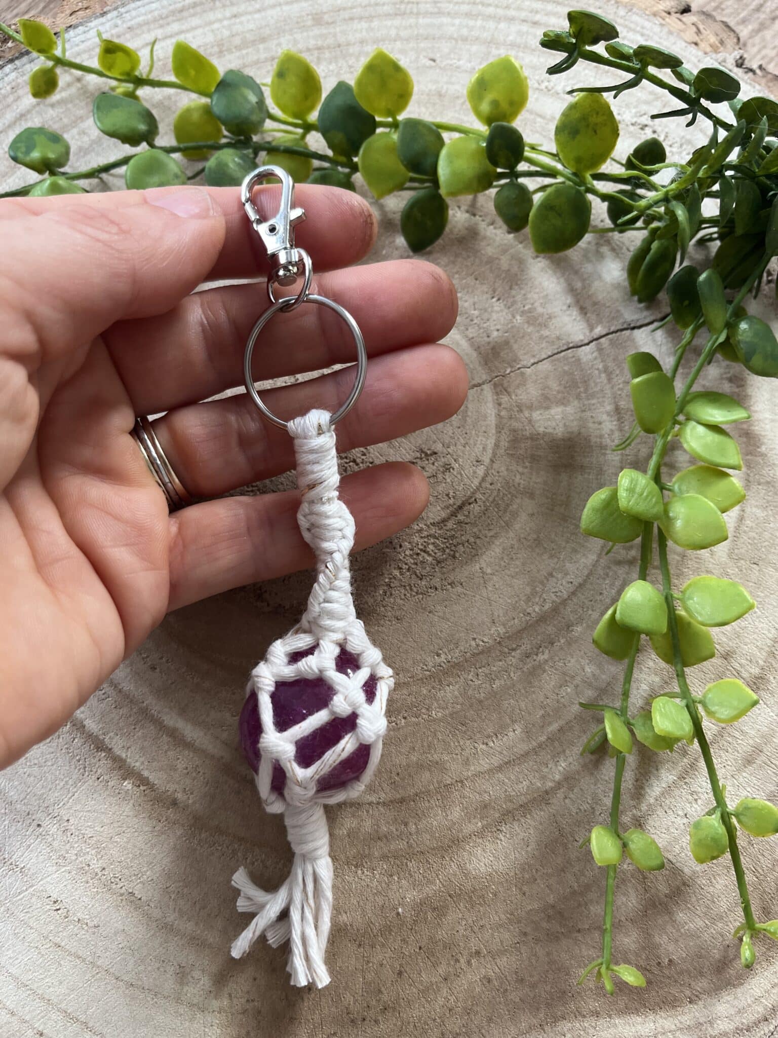 Handmade macrame keychain, with pink crackle Quartz gemstone, made using recycled cotton in golden natural, on a metal lobster clasp.