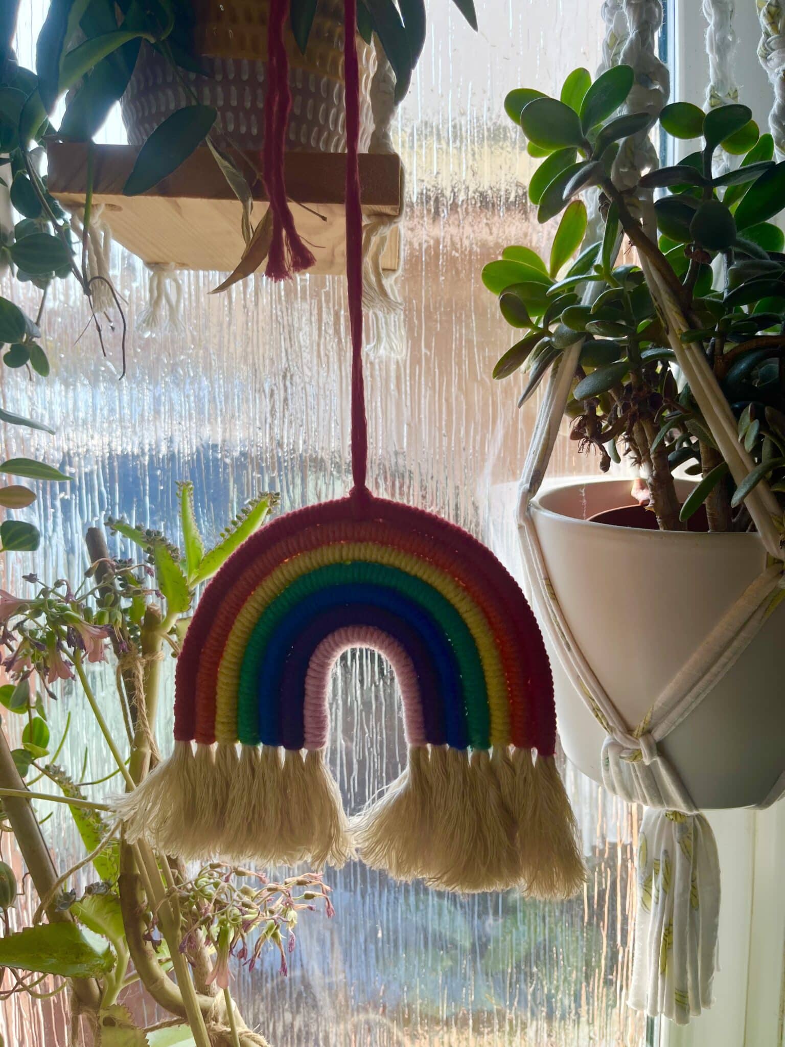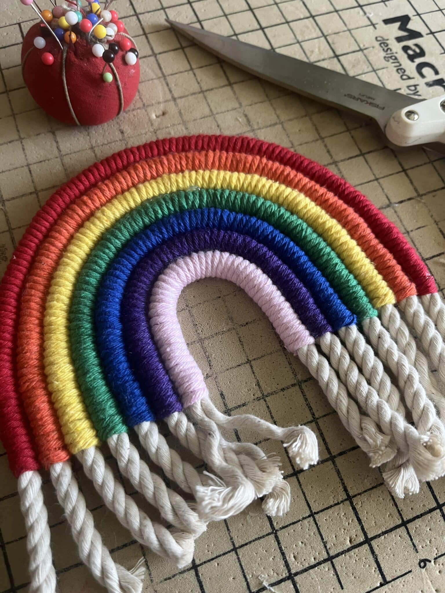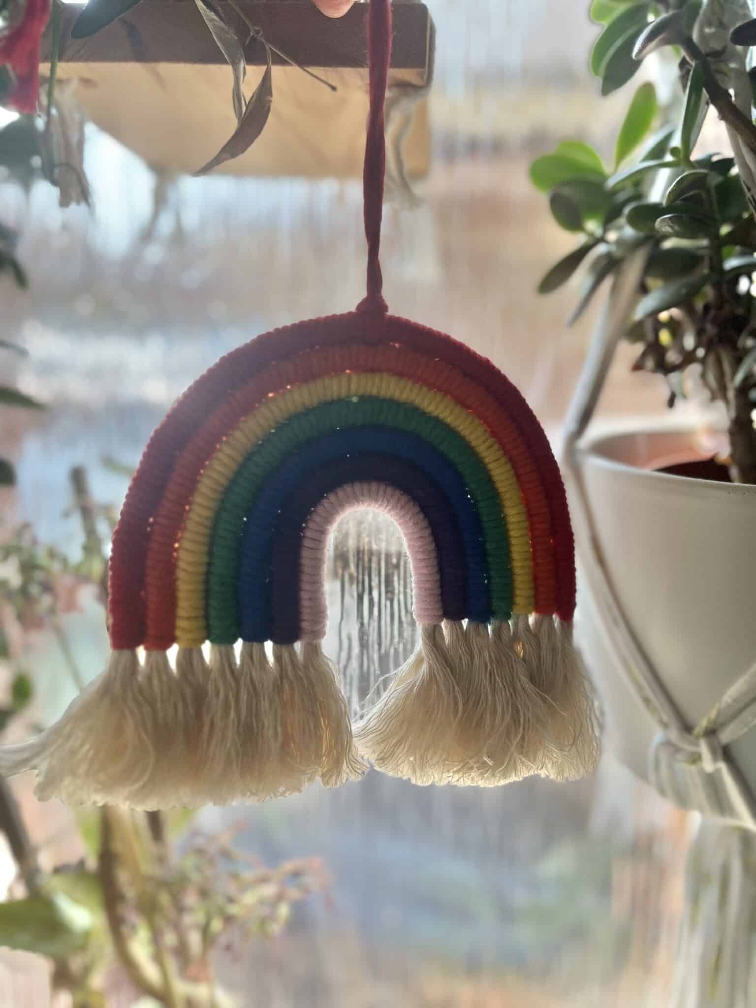 Handmade macrame rainbow, made using 7 rainbow colours of recycled cotton yarn.