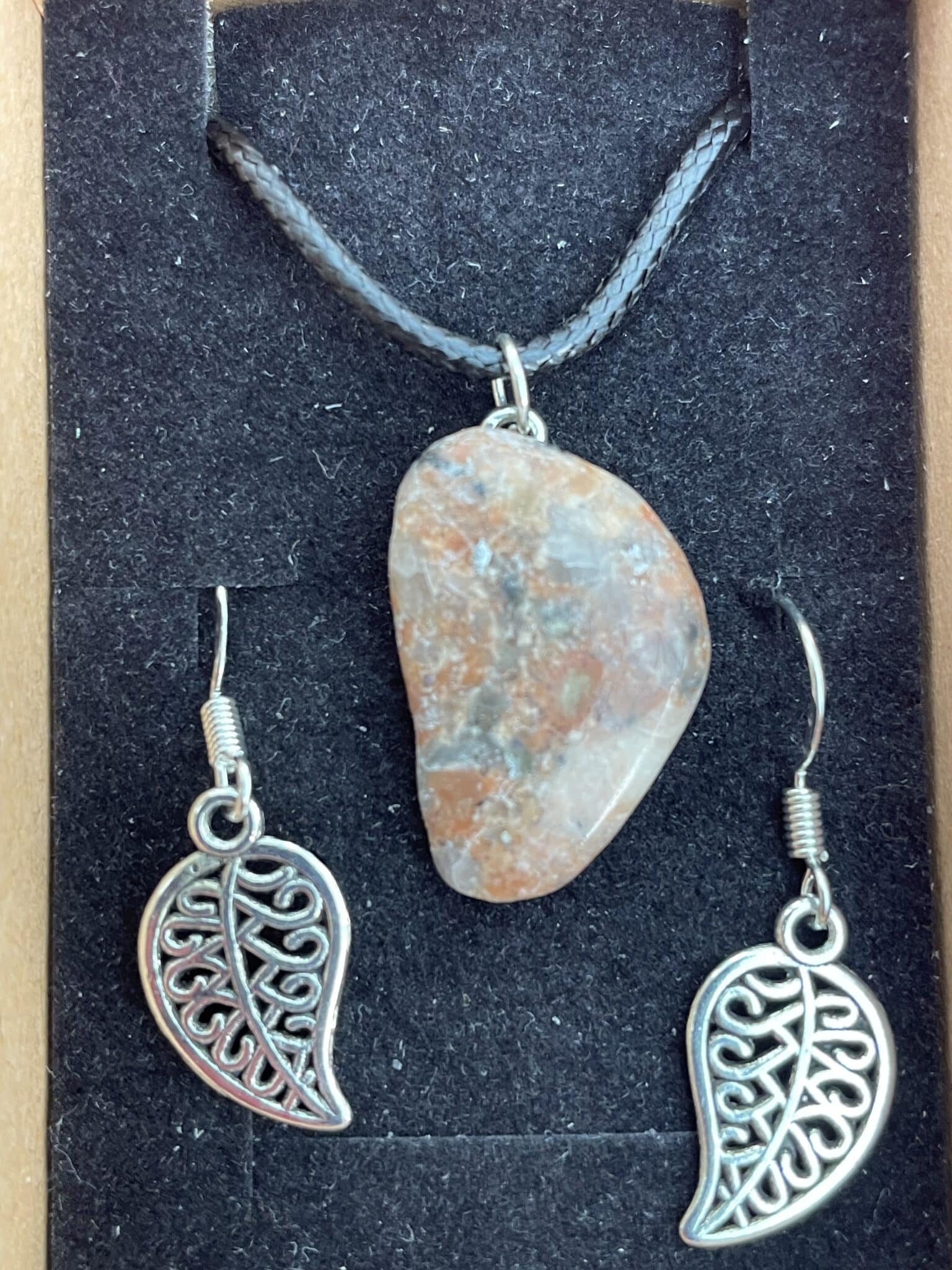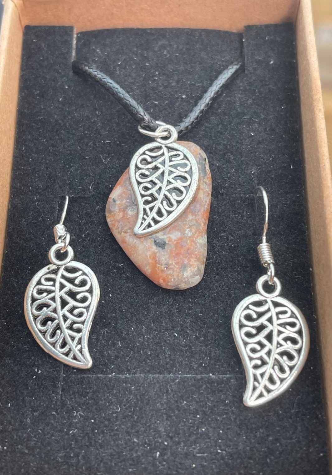 Beautiful red Cornwall granite pendant on a black leather cord necklace comes with a set of free silver alloy autumn leaf earrings with sterling silver hooks.